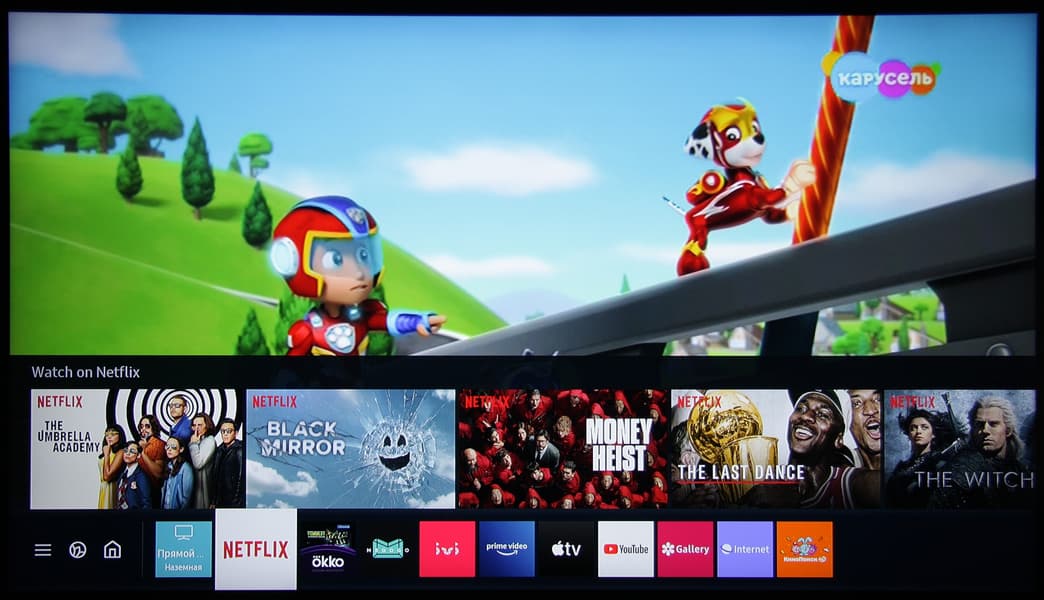 Программной платформой для этого ТВ служит открытая операционная система Tizen, основанная на ядре Linux. Заглавная страница интерфейса представляет собой две горизонтальные ленты. Верхняя — с контекстным содержимым, например, с подписанными миниатюрами быстрых настроек, входов и устройств или с рекомендованным контентом, соответствующим выбранному приложению. На нижней ленте размещены значки выбора настроек, функций, источников, магазина приложений, а также плитки-миниатюры установленных программ и избранных входов. Плитки на нижней ленте (именно плитки) можно переставлять и удалять, а также добавлять к ним плитки установленных приложений и плитки прямого выбора входов.