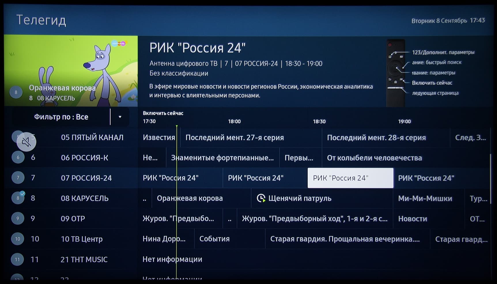Есть хорошая поддержка электронной программы передач (если она передается) — можно посмотреть, что именно идет на текущем и других каналах, запрограммировать просмотр программы или сериала и т. д.
