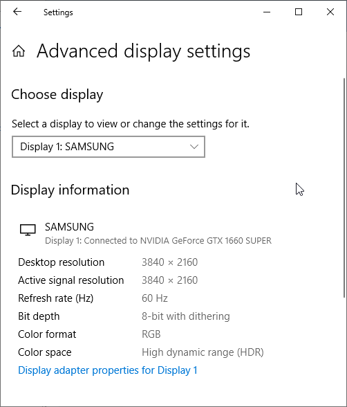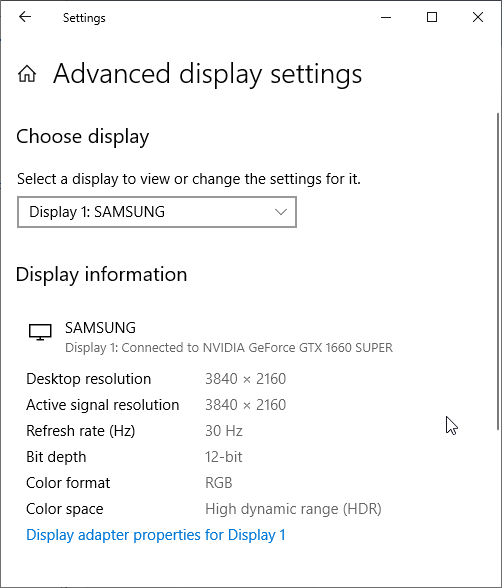 Под Windows 10 вывод в режиме HDR на данный телевизор возможен при выборе соответствующих опций в настройках дисплея. При разрешении 4К и 60 Гц вывод идет в режиме 8 бит на цвет, дополненных динамическим смешением цветов, видимо, с помощью видеокарты на аппаратном уровне. При 30 Гц — 12 бит на цвет (динамическое расширение до 10 бит выполняется уже самим ТВ):