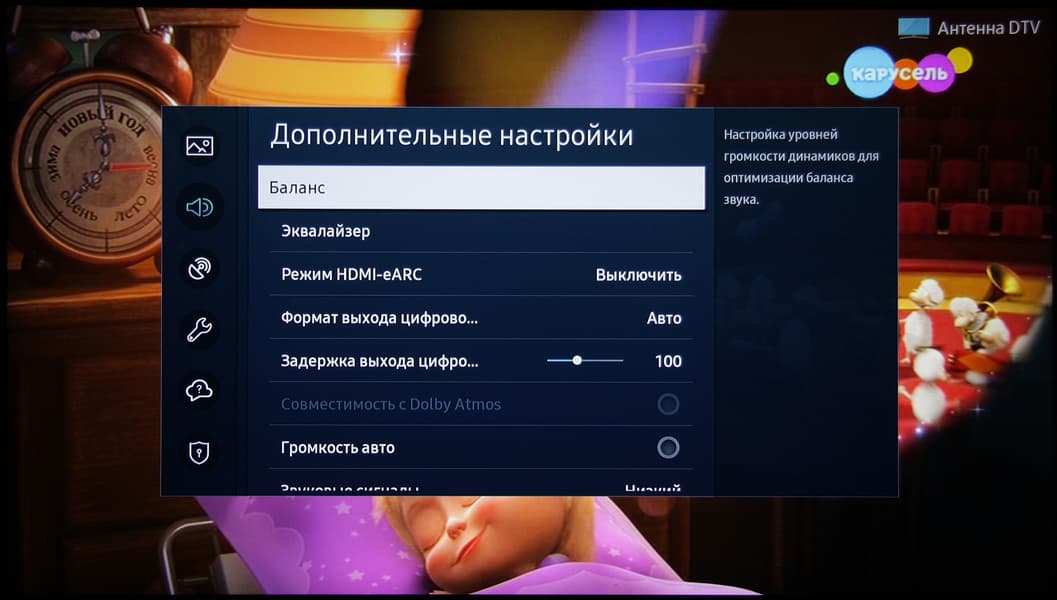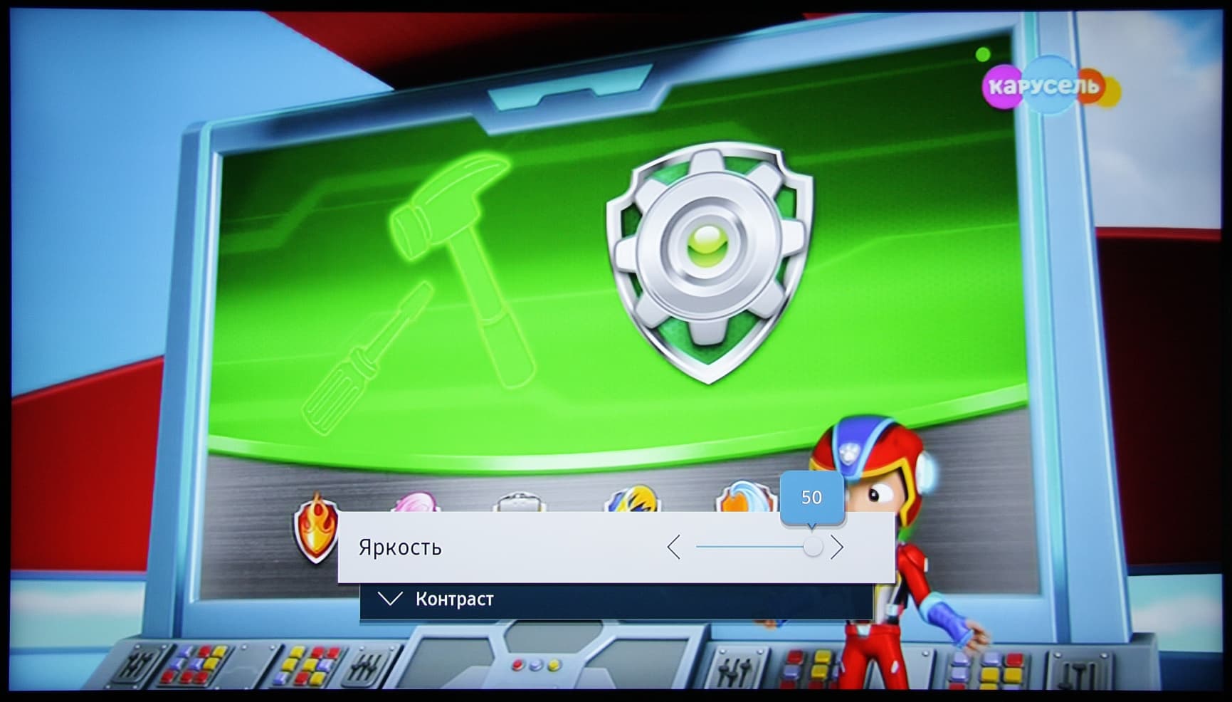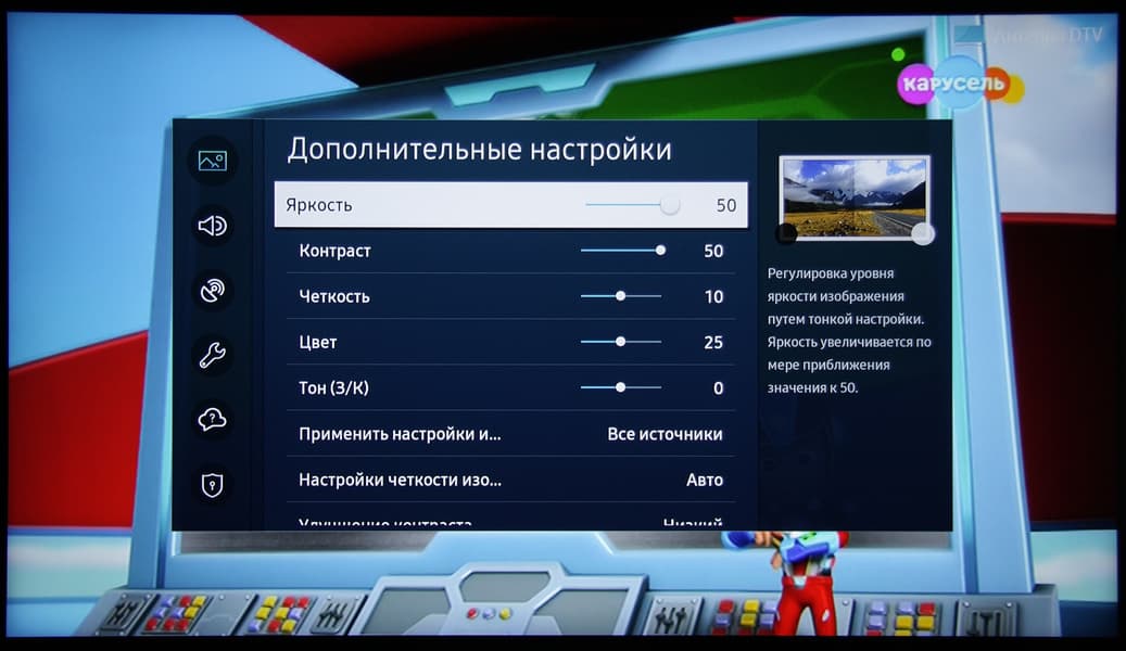 Отметим, что в целом ни к стабильности работы, ни к отзывчивости оболочки у нас никаких претензий не возникло. На команды с пульта ТВ реагирует почти моментально. Несмотря на разнообразную анимацию и звуковые эффекты, навигация по меню быстрая. Правда, нет кнопки быстрого доступа к настройкам, а возврат из меню с настройками к текущему просмотру выполняется через главный экран. Меню с настройками ТВ занимает большую часть экрана, надписи в нем читаемые.