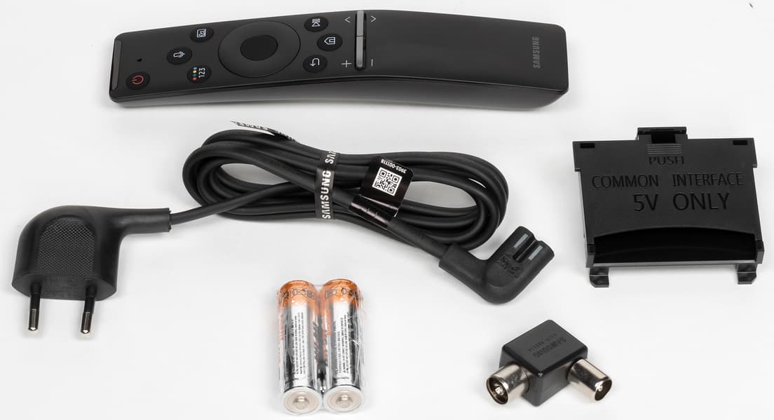Корпус пульта изготовлен из черного пластика с матовой поверхностью. Пульт слегка изогнут под руку и удобно в ней лежит. Кнопок на пульте немного, их обозначения достаточно крупные и контрастные. Ход кнопок короткий и умеренно тугой. Есть две кнопки-качалки изменения громкости и переключения ТВ-каналов. Короткое нажатие на эти кнопки без отклонения выключает/включает звук и выводит ТВ-программу; длинное нажатие — показывает меню улучшения доступности и список ТВ-каналов, соответственно. Нажатие на две другие кнопки выводит на экран две различные панели с виртуальными кнопками, также долгое нажатие на кнопку включения интерьерного режима Ambient выводит контекстное недокументированное меню, дающее быстрый доступ к некоторым функциям. Однако в целом все это, как нам кажется, не компенсирует неудобства, связанные с очень скудным набором кнопок. Большие пульты традиционного вида все равно удобнее. В передней части пульта есть отверстие микрофона, через которое видно мигание красного индикатора, указывающего на передачу команд с пульта. Нажатие на кнопку с изображением микрофона приглушает звук телевизора и переводит его в состояние ожидания голосовой команды. О каких-то воспринимаемых телевизором командах можно догадаться, что-то можно подсмотреть во встроенной справке. Но не всегда инструкция в справке соответствует реальности. Хорошо работает выбор ТВ-канала по его номеру, переключение голосом на входы и на программы, выбор режимов изображения и т. д., однако в целом странностей и несоответствий в случае голосового управления слишком много, поэтому оно скорее не работает, чем работает (при этом тенденции к улучшению нет, стало даже хуже, чем было в начале 2020 года в случае другой модели от этого производителя). Все нераспознанное как команды телевизор предлагает поискать, и в результатах поиска будут видеоролики с YouTube.