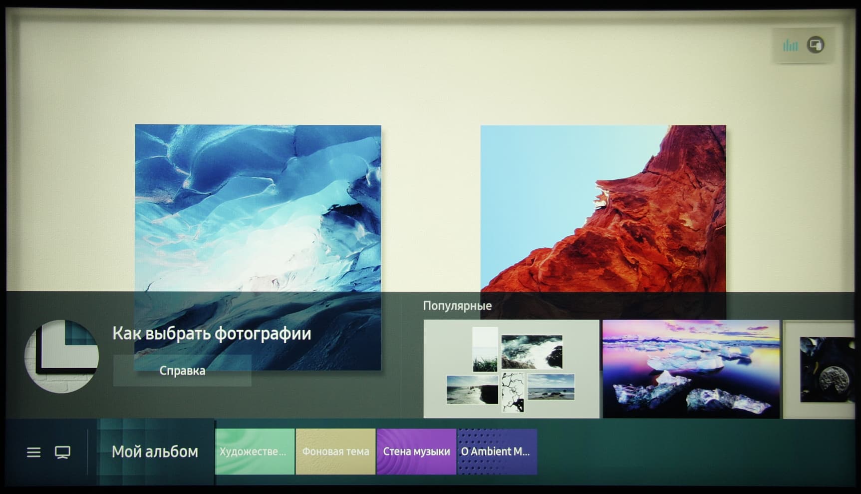 Специальный режим Ambient предназначен для демонстрации заставки на условно выключенном телевизоре. В этот режим работающий телевизор переключается при коротком нажатии на специальную кнопку на пульте, или из главного меню, или из приложения SmartThings, или голосовой командой.