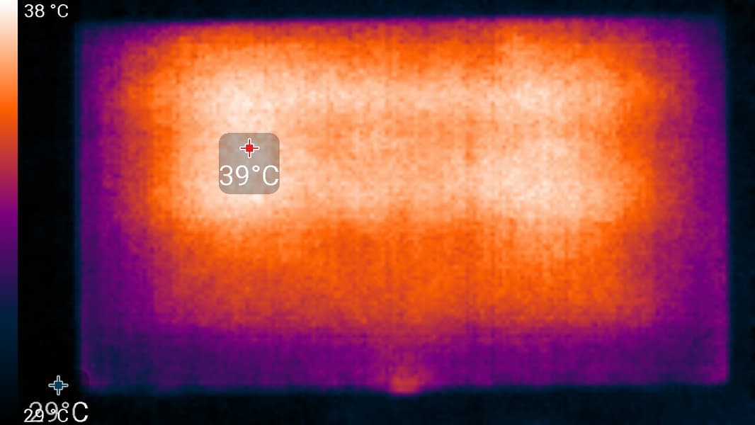Нагрев телевизора спереди можно оценить по приведенному снимку с ИК-камеры, полученному после долговременной работы на максимальной яркости в помещении с температурой примерно 24 °C:
