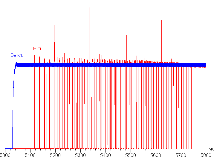 Есть функция динамической регулировки яркости подсветки. В большинстве режимов она включена и отдельно пользователь не может ее включить или выключить. Если она активна, то яркость снижается на темных изображениях и на черном поле во весь экран подсветка отключается совсем. При смене темных изображений на светлые яркость подсветки повышается. Особой пользы от этой функции нет, а вот постоянная смена яркости очень раздражает. Впрочем, в режиме подключения к ПК от этого можно избавиться, выставив частоту обновления на 60, 59, 30 или 29 Гц. График ниже показывает, как меняется яркость (вертикальная ось) при переключении с черного поля (после 5 секунд выдержки) на белое при включенной и выключенной функции динамической регулировки яркости подсветки:
