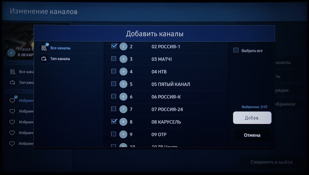 Отметим, что при настройках по умолчанию качество масштабирования и итоговое качество картинки довольно высокое, даже в случае обычного SD-сигнала. Впрочем, какие-то каналы и/или передачи идут с настолько низким качеством, что даже на этом ТВ они выглядят отвратительно. Особенности российского бесплатного эфира. Присутствуют списки любимых каналов.
