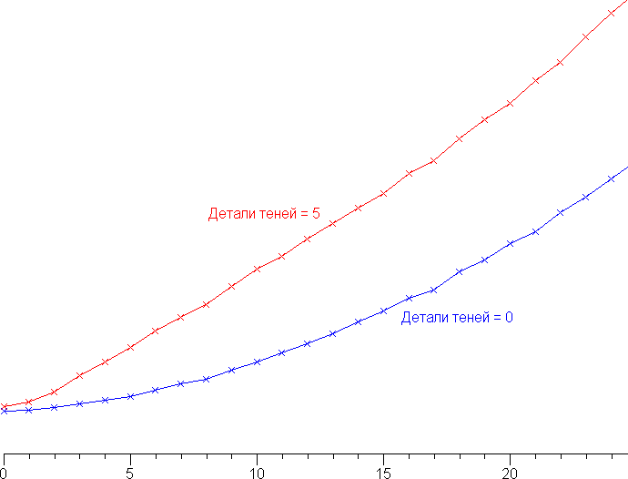 Видно, что уровень черного чуть-чуть (визуально это даже не видно) возрастает, но различимость деталей в тенях явно улучшается. При этом в светлой части гамма-кривой характер роста яркости не меняется.