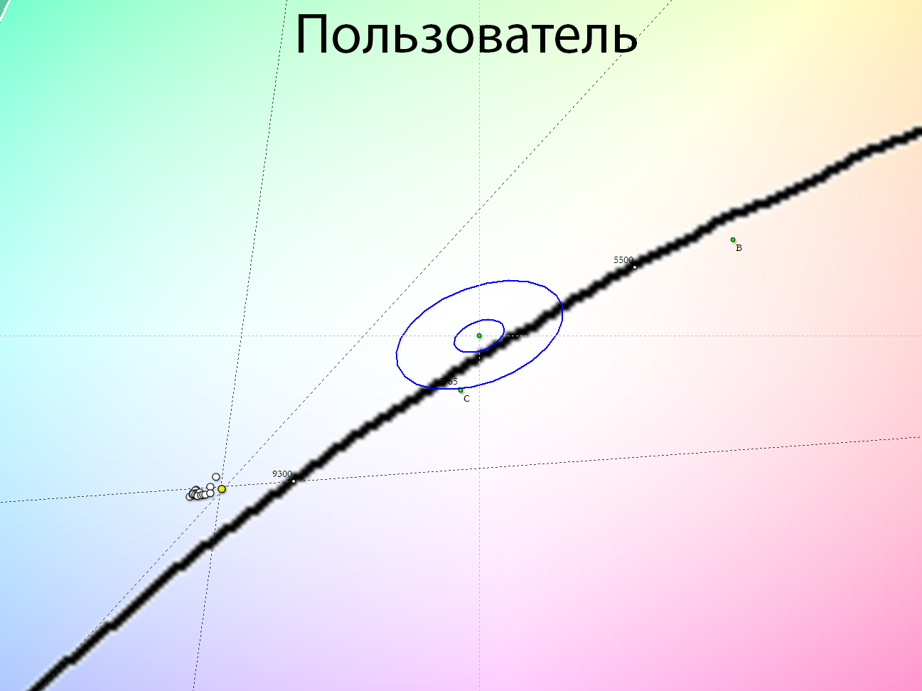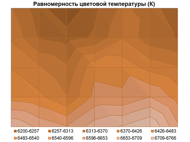 Равномерность цветовой температуры — на том же среднем уровне: среднее отклонение от центральной точки составило 2%, а максимальное — 5%. Вариация ЦТ оказалась близка к 570 К, что можно заметить в реальном использовании, если будет такое желание, но при использовании Skyworth как мультимедийного центра где-то на природе, на даче, в бане вы вряд ли захотите этим заниматься.