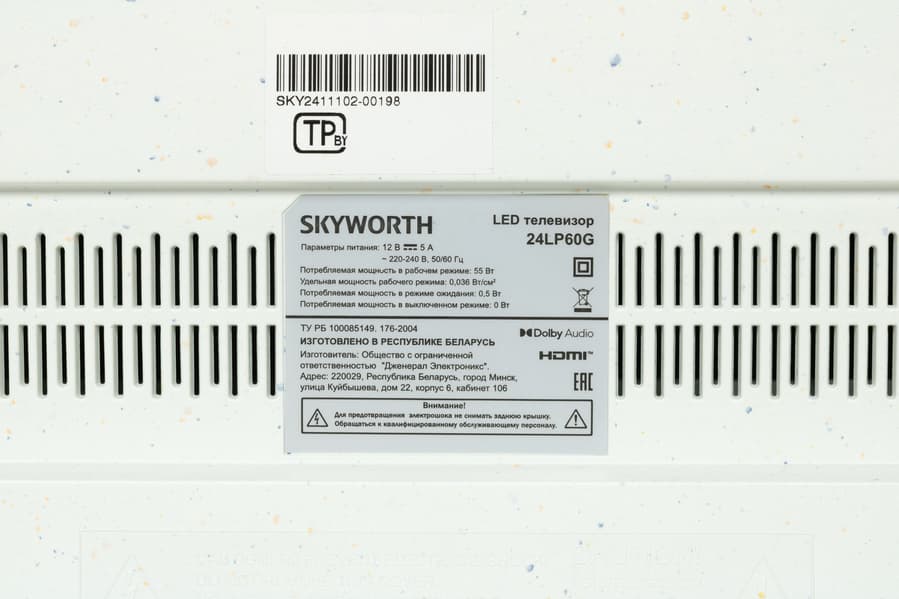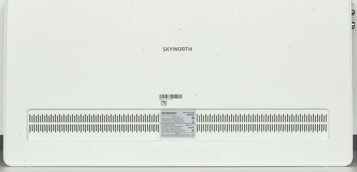 Выделенный громкоговоритель низких частот (сабвуфер) в телевизоре Skyworth не используется. Звук направлен вперед, поддерживается система улучшения пространственного звучания Dolby Audio. Особая решетка в задней части корпуса — лишь для вентиляции внутренней начинки.
