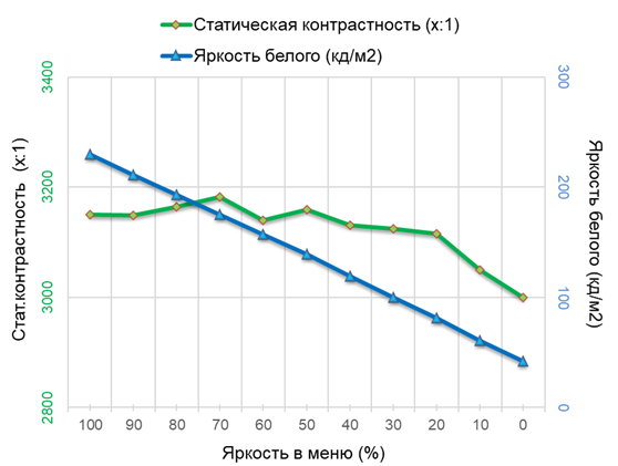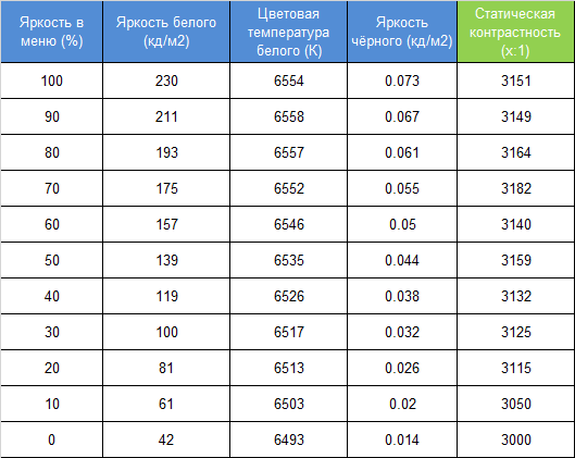 После калибровки со значительными правками RGB-сигнала для приведения точки белого в норму (6500 К) коэффициент контрастности составил 3100:1 в среднем, а яркостный диапазон — 42—230 нит. Более подробные результаты после такой настройки представлены на графике и таблице выше.