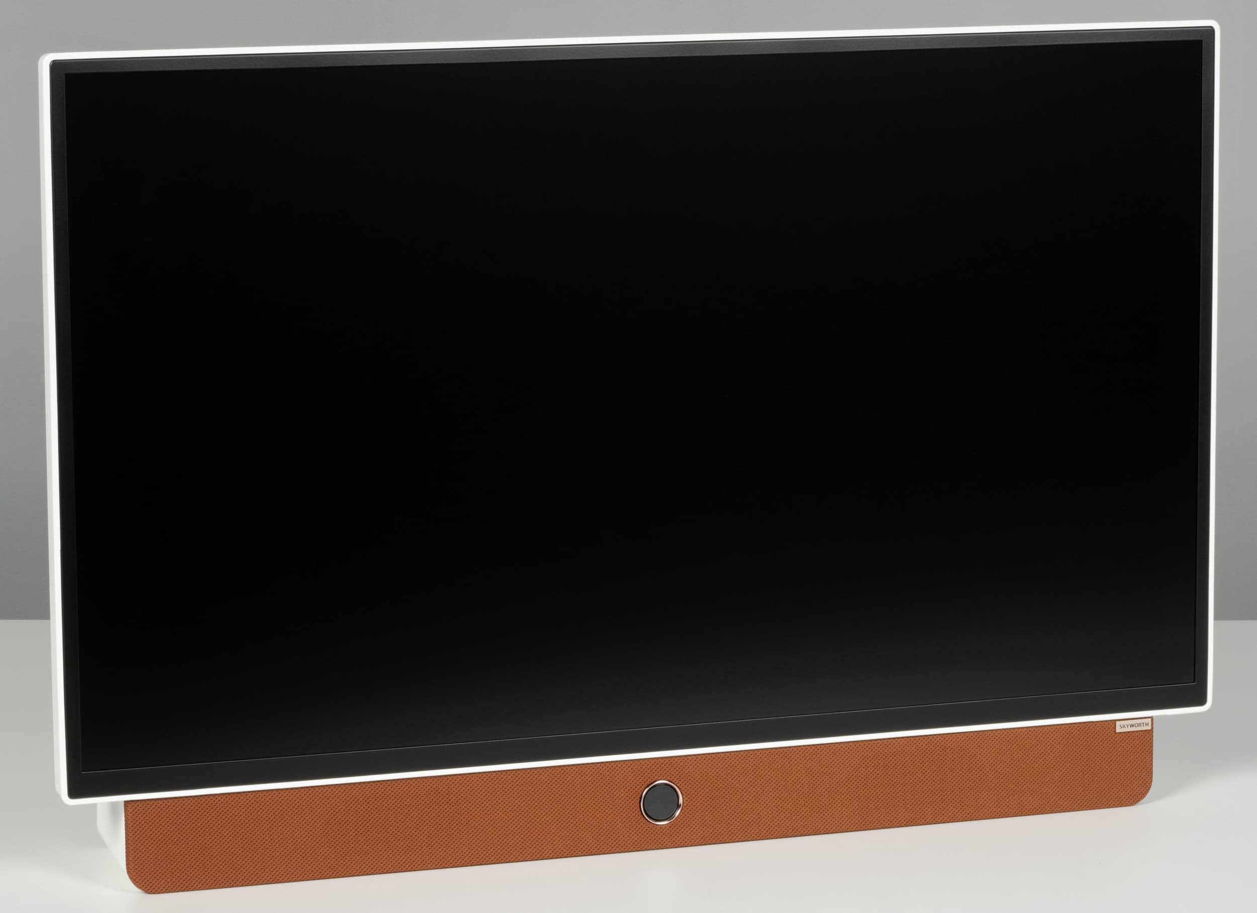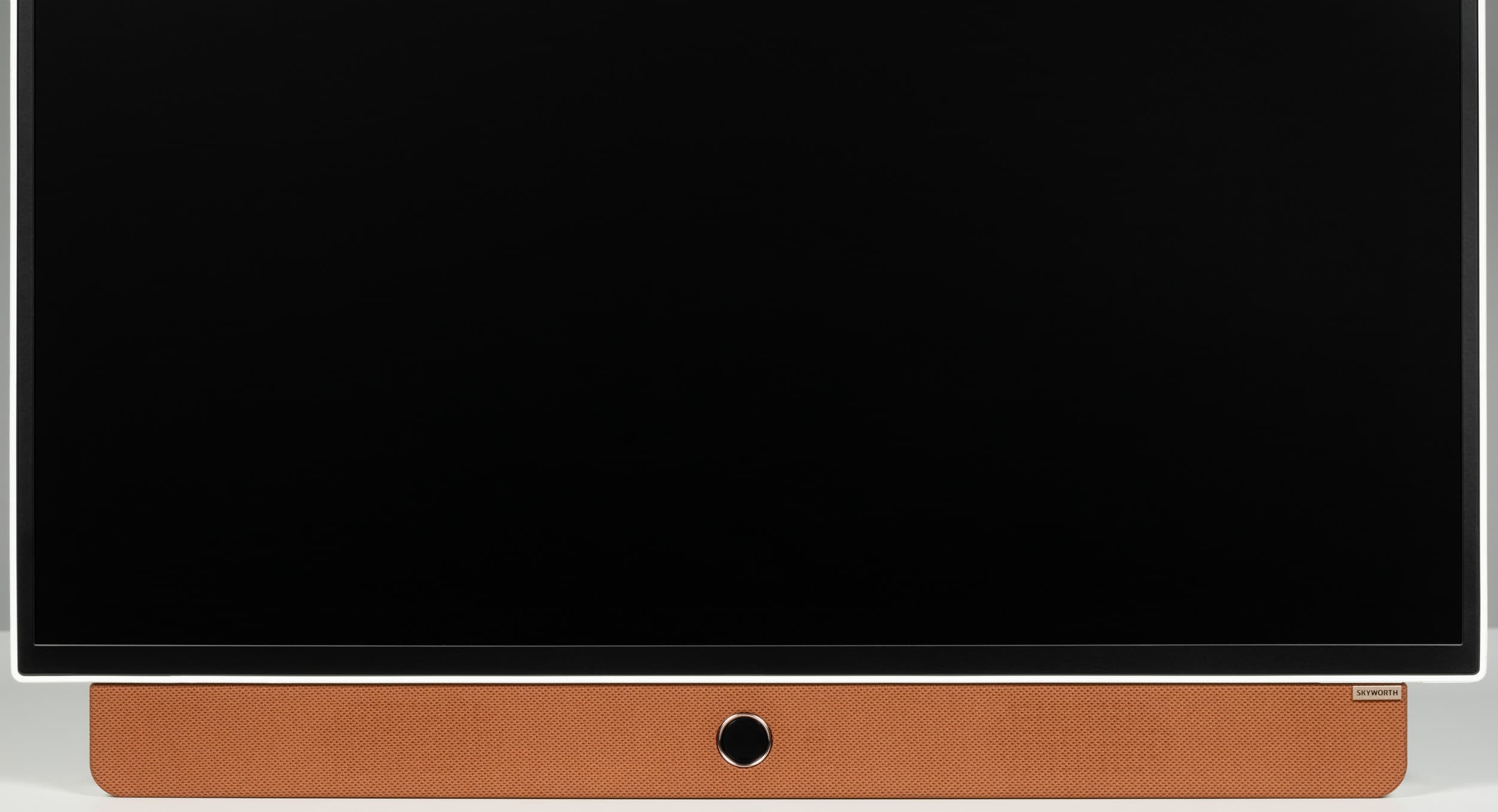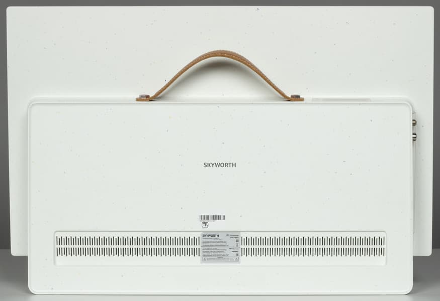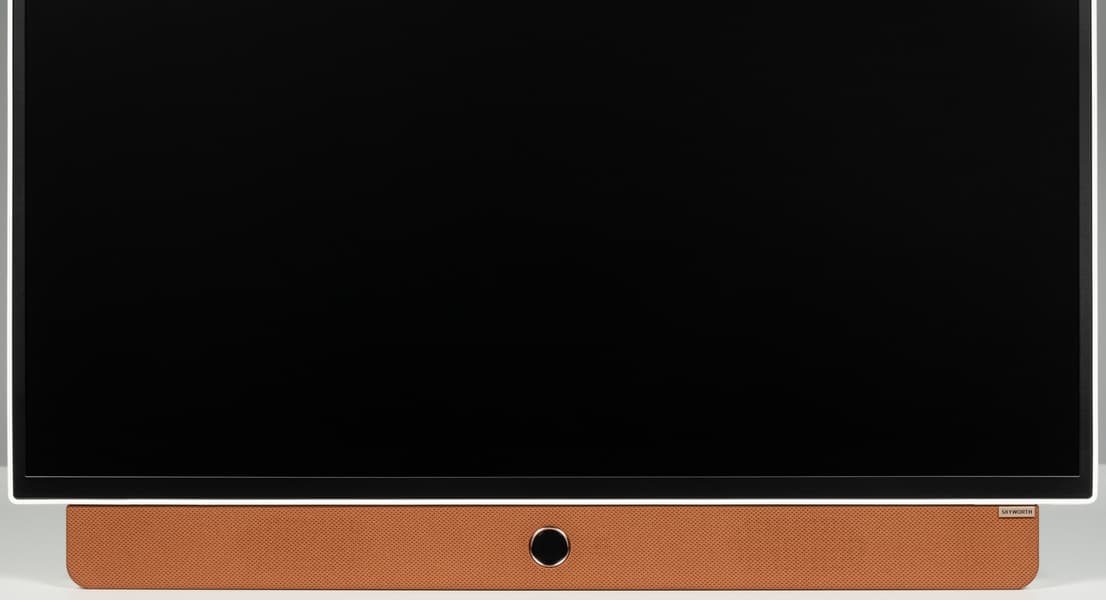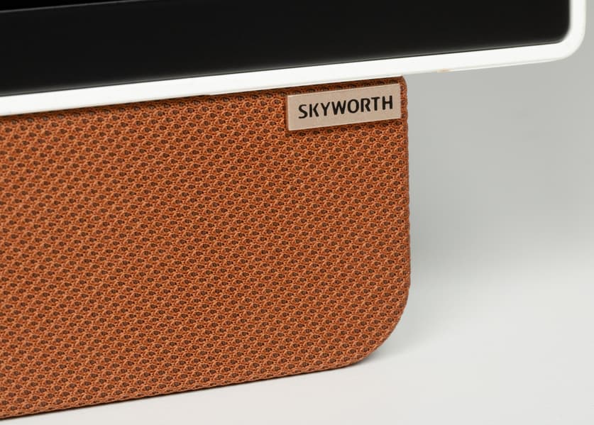 Упоминание бренда Skyworth встречается на задней части корпуса и в виде накладки с гравировкой в нижней части спереди. Последняя представляет из себя панель на 80% ширины экрана, а за тканевой обивкой коричневого цвета спрятаны два громкоговорителя.
