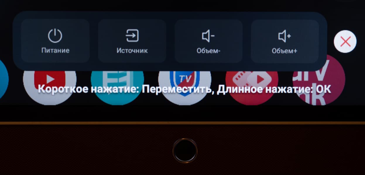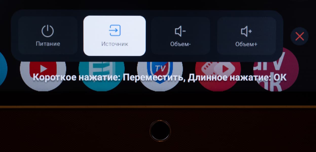 При необходимости последующее нажатие кнопки выводит небольшой блок с небольшим списком опций: выключение питания, выбор источника, регулировка уровня громкости (с неверным русским переводом «Объем»). Для перехода между функциями требуется короткое нажатие, для их использования — длинное.