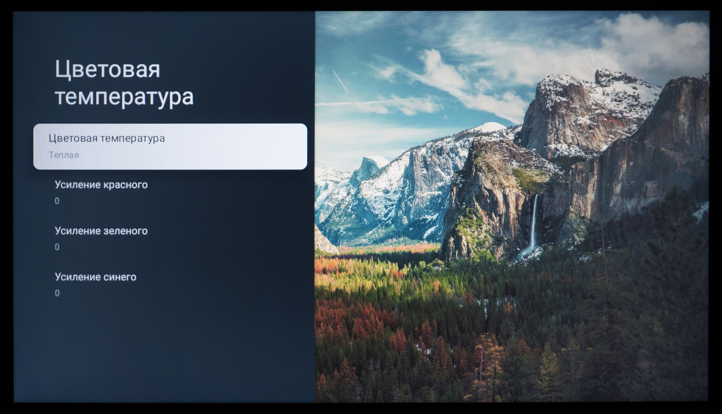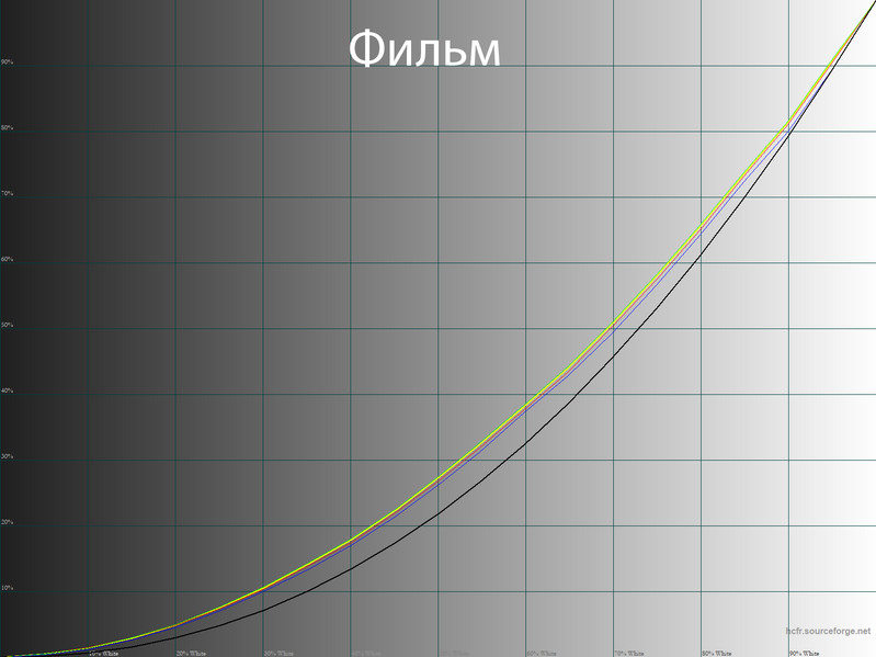 При активации режима «Фильм» усиливается проявление красной и зеленой компоненты, меняется цветовой баланс, картинка перестает быть настолько холодной, как при заводских установках.