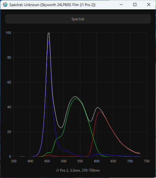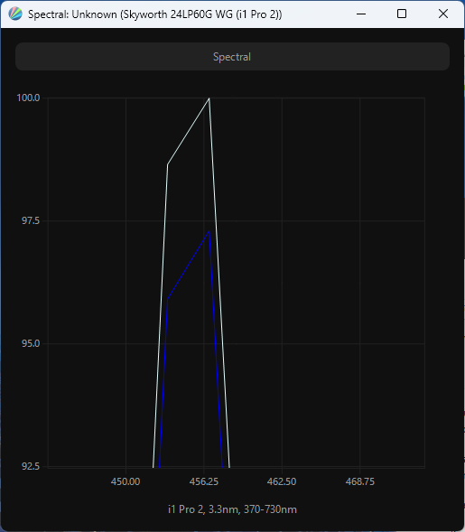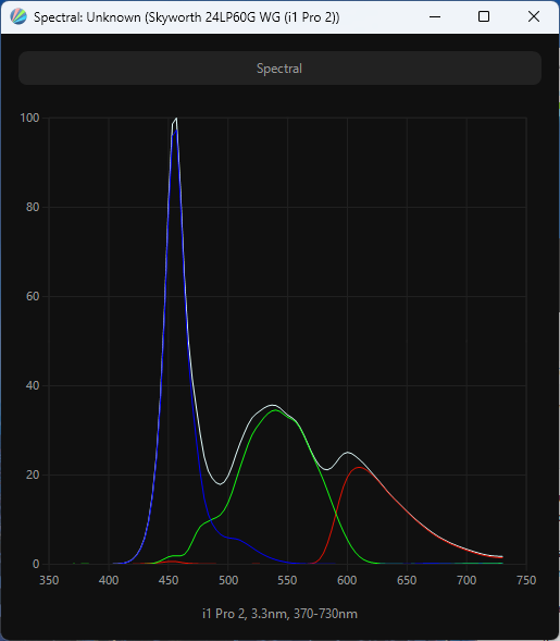 Виден сдвинутый пик синего, приходящийся на 456 нм, что формально обеспечивает снижение нагрузки на глаза и может претендовать на получение современных сертификатов безопасности. По всему же спектру подсветки можно сделать очевидный вывод, что перед нами классический представитель лагеря W-LED, без использования актуальных модификаторов спектра. В этом случае следует рассчитывать на цветовой охват на уровне sRGB/Rec.709.