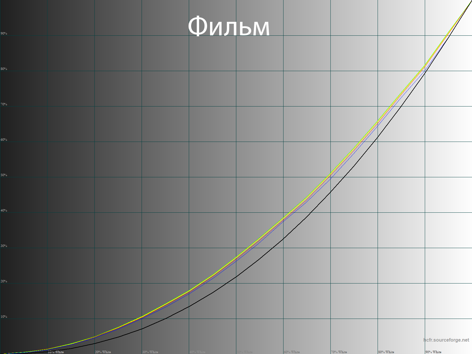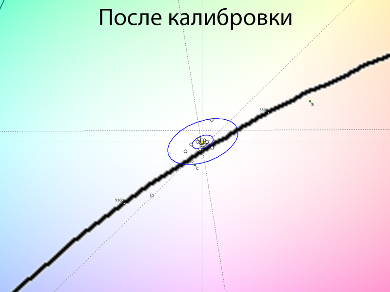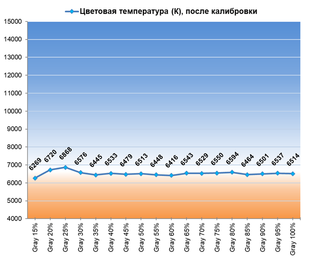 После настройки и калибровки точка белого и все точки серого клина пришли в норму, баланс изображения стал нейтральным — без проявленных паразитных оттенков. Стабильность ЦТ оттенков серого установилась на высоком уровне — как и при заводских установках и в режиме «Фильм».