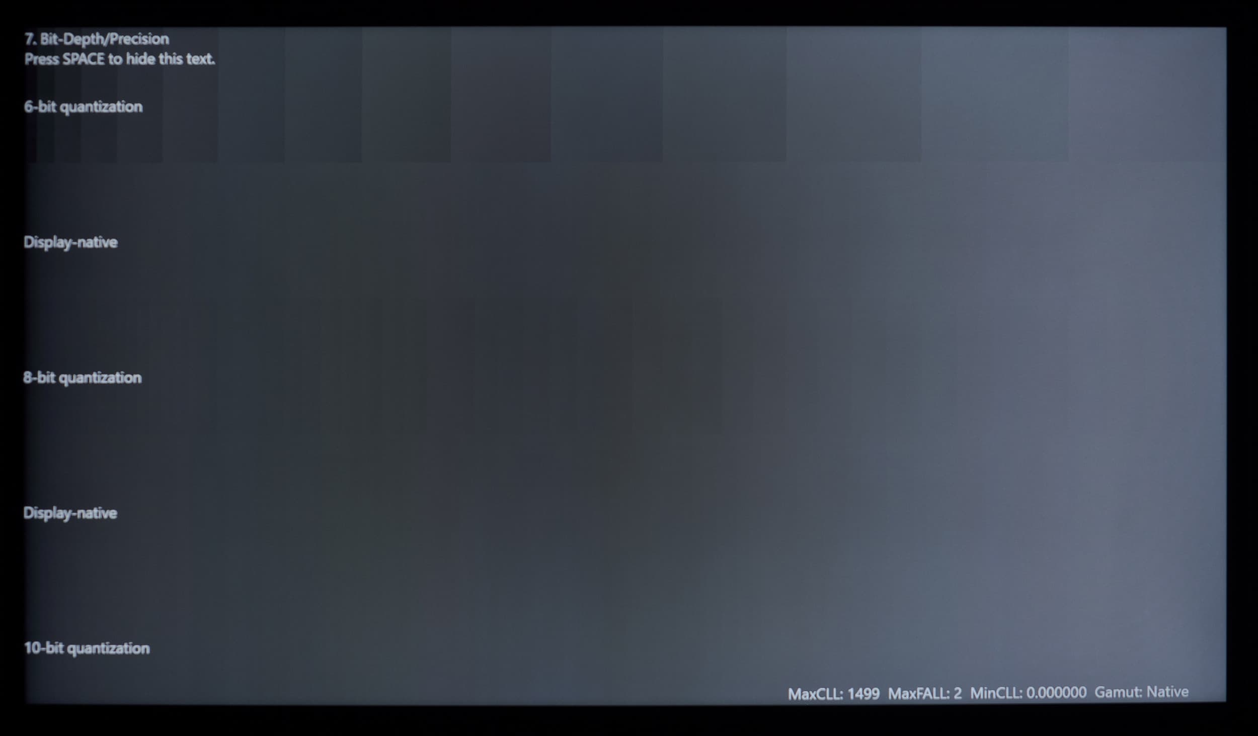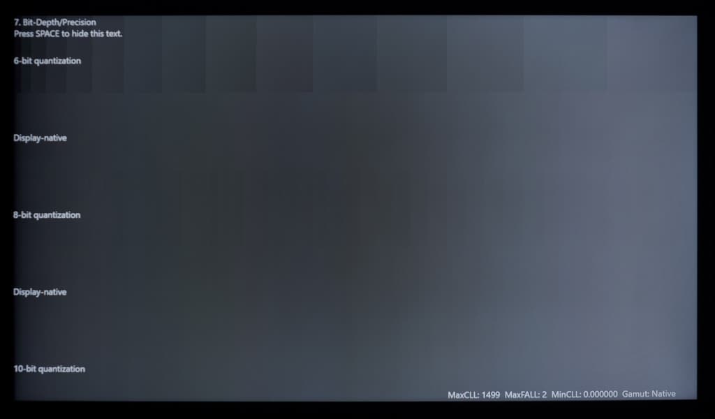 Качественную оценку мы начнем с демонстрации градиентов при выводе специального изображения из теста DisplayHDR Test при активном HDR в системе Windows, в 10-12-битном режимах (программная эмуляция со стороны GPU в случае подключения к ПК/ноутбуку).