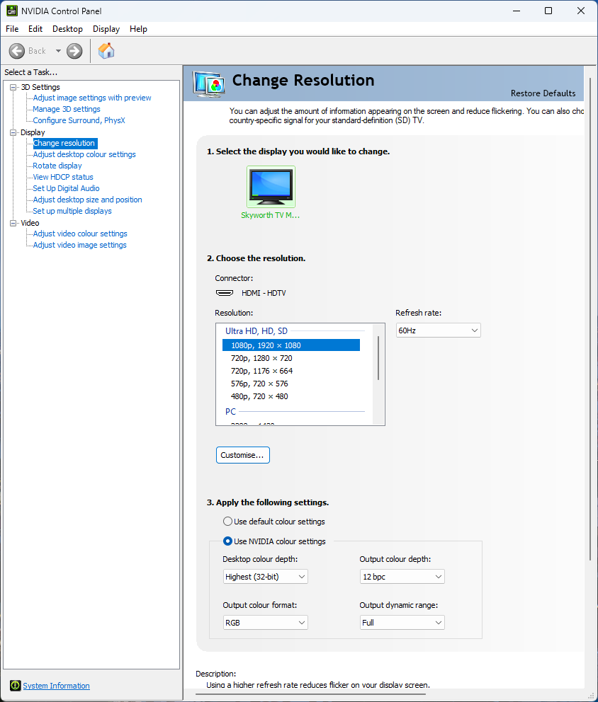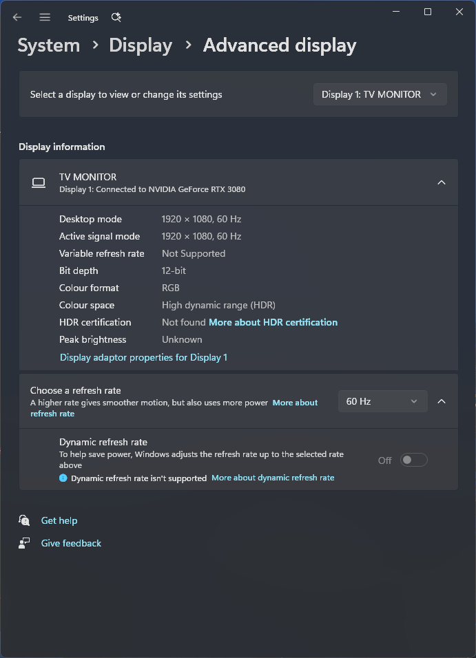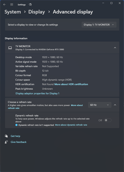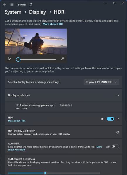 Под Windows 11 вывод в режиме HDR на данный телевизор возможен при выборе соответствующих опций в настройках дисплея. При нативном разрешении вывод может идти в режиме вплоть до 12 бит на цвет (по выбору пользователя) в отсутствие цветового сжатия и при полном рабочем диапазоне (0—255). Очевидно, что сама матрица неспособна работать в таком режиме, а поэтому это лишь расширение потока со стороны видеокарты — качество картинки от этого лучше не станет.
