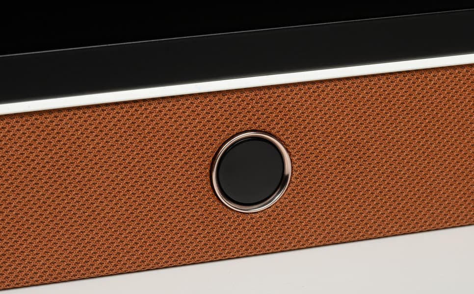 В нижней части корпуса спереди, ровно по центру, есть полупрозрачная кнопка со стилизованным обрамлением с мягкой контурной подсветкой. Данная клавиша позволяет выводить телевизор из режима сна, а также выключать его, переключать источники сигнала и регулировать уровень громкости встроенной акустической системы.