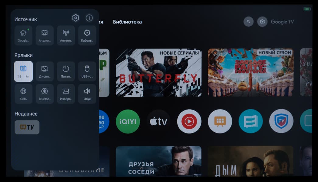 При нажатии на кнопку выбора источника на пульте ДУ на экране телевизора слева появляется блок с функциями быстрого доступа: сами источники и ярлыки для функций или приложений, а также список недавно открытых.