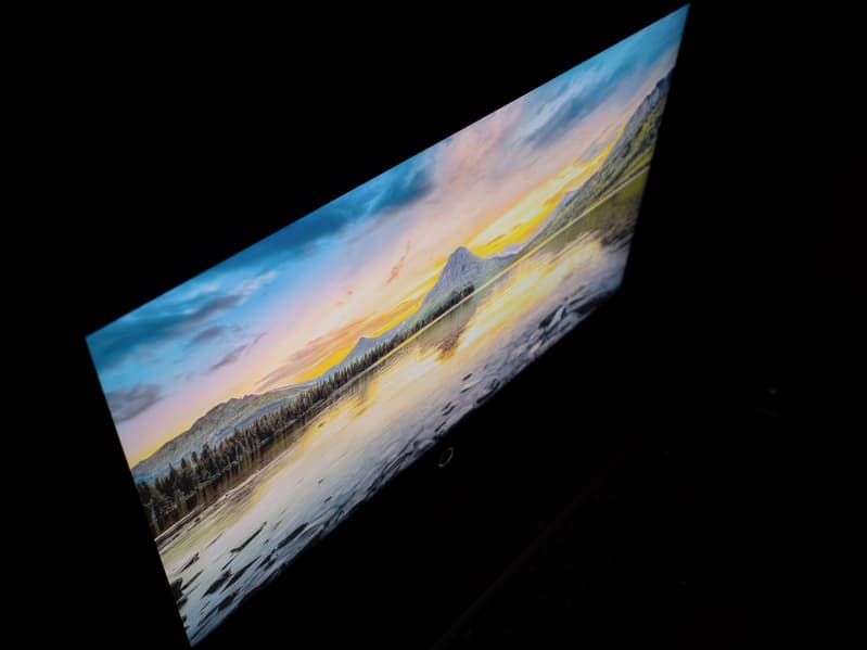Можно отметить относительно плавное уменьшение яркости при отклонении от перпендикуляра к экрану во всех трех направлениях в относительно широком диапазоне углов, но с гораздо более быстрым высветлением глубоких темных участков изображения, потерей контрастности и насыщенности. В некоторых случаях можно наблюдать проявление пастеризации картинки на сложных переходах, а также усиление видимости дефектов картинки от примененного сжатия.