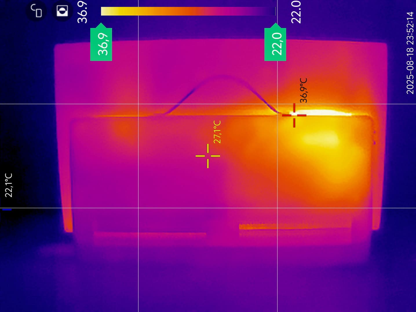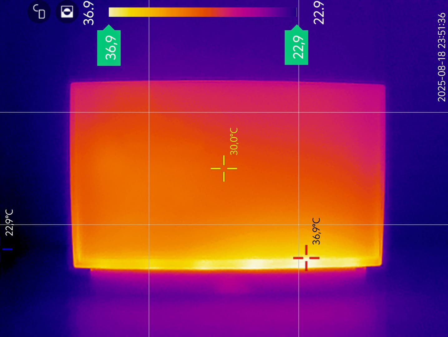 На передней поверхности диапазон температуры составил от 29 до 36 градусов с локализацией самых теплых участков в верхней правой стороне экрана и по краям снизу. Также выражены точечные участки по нижней грани, свидетельствующие, скорее всего, о небольших «утечках» подсветки в этих местах.