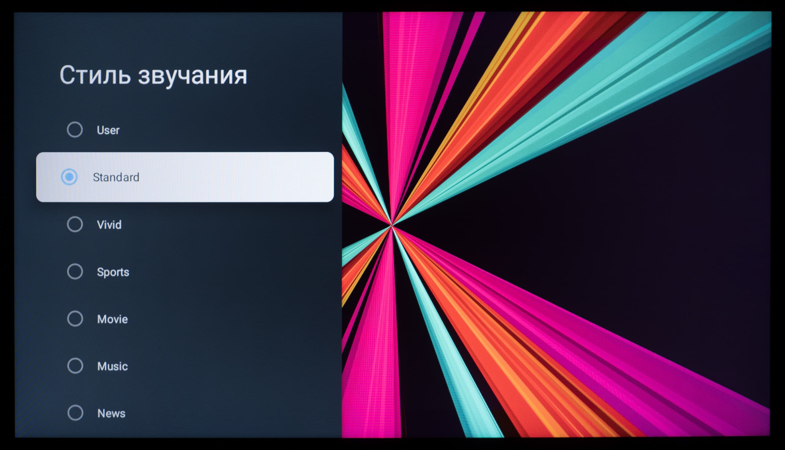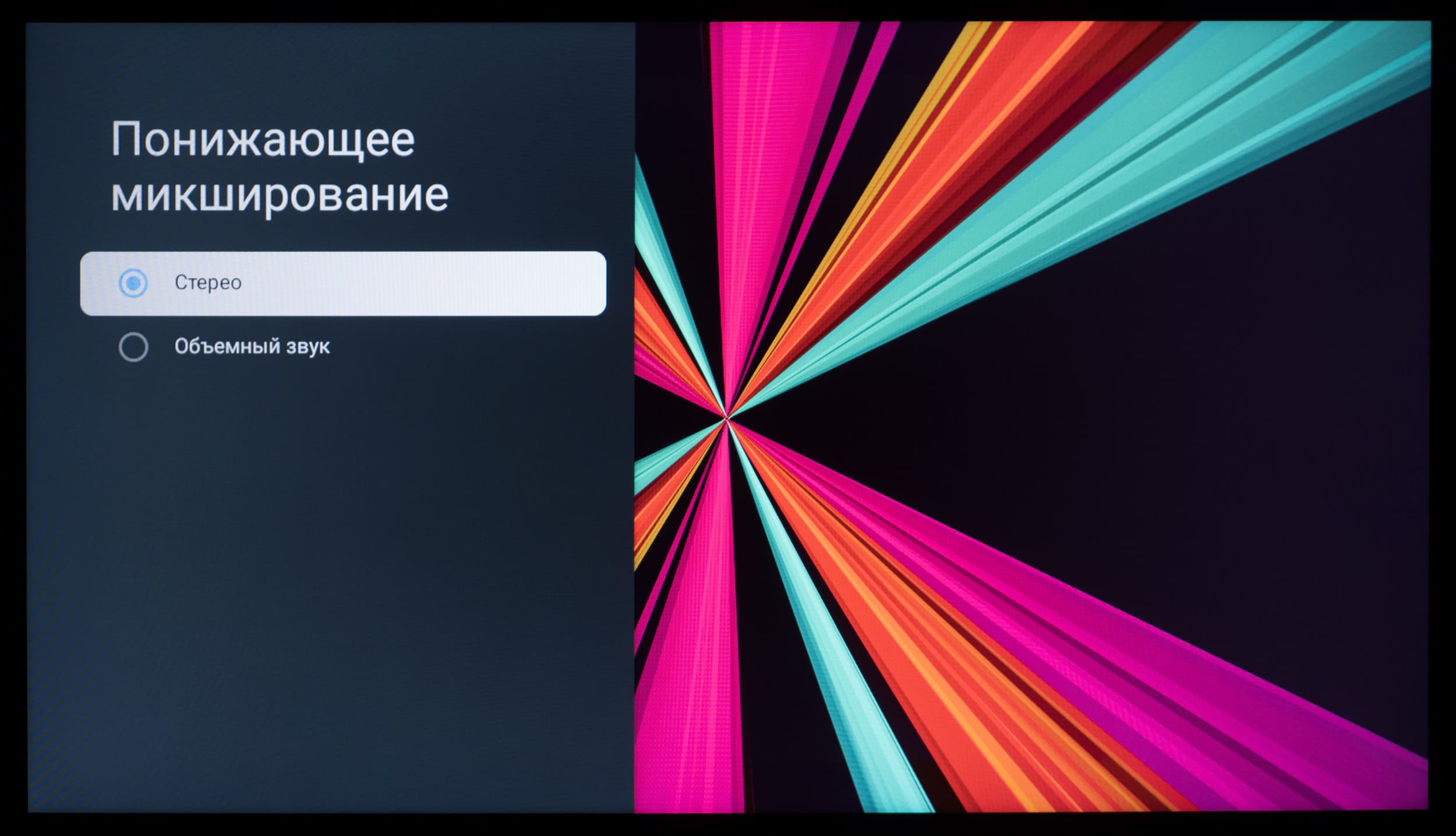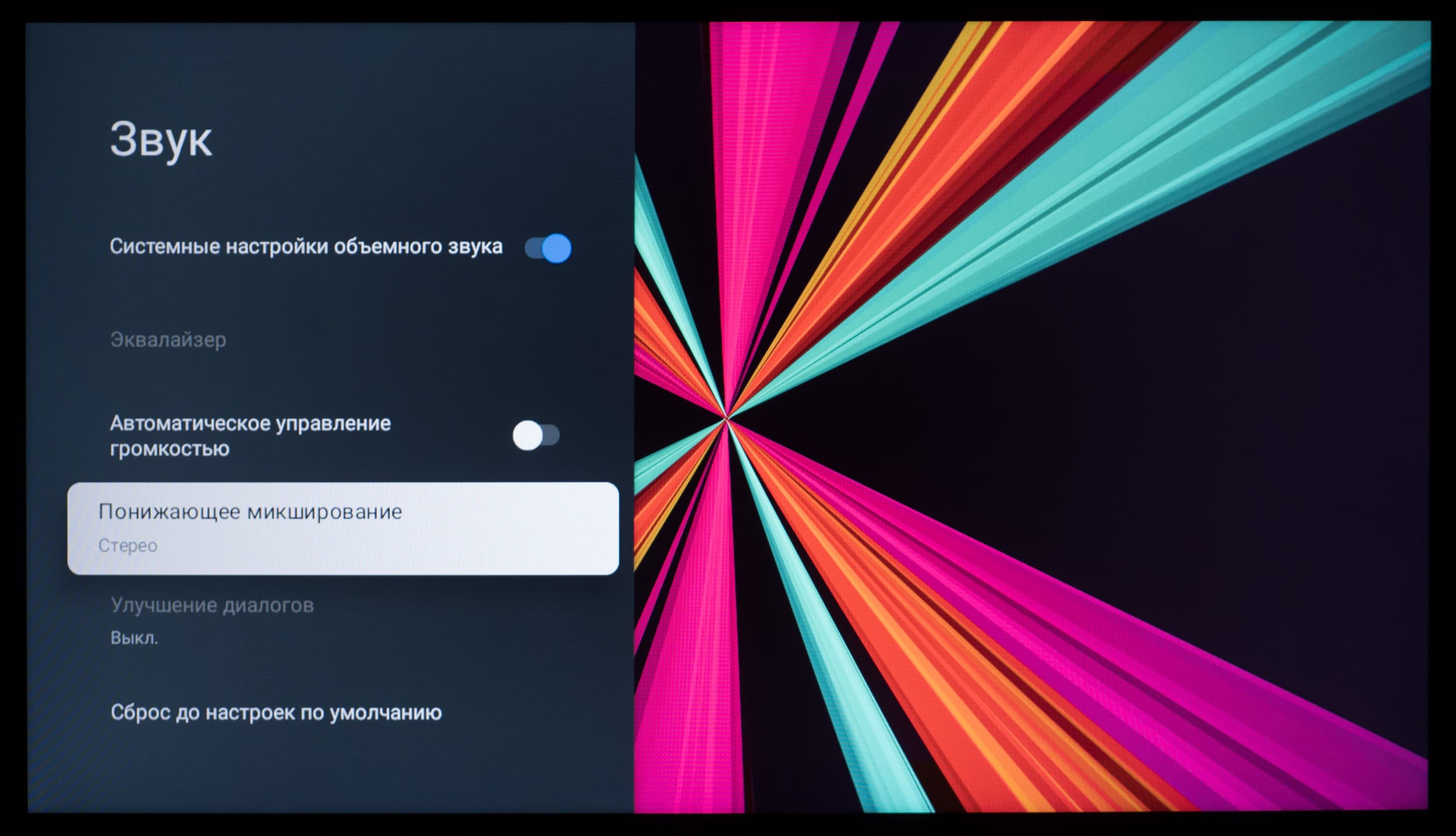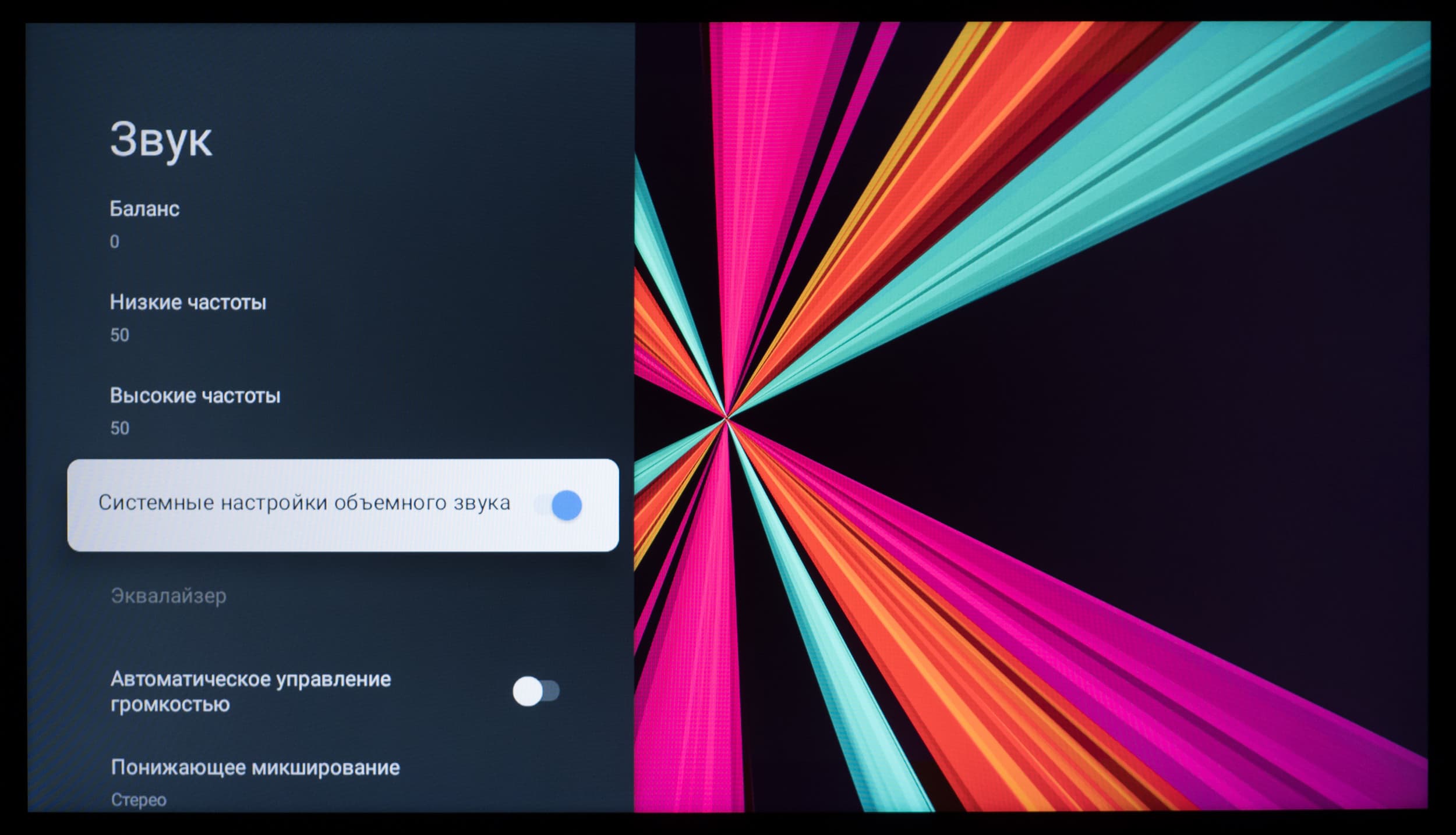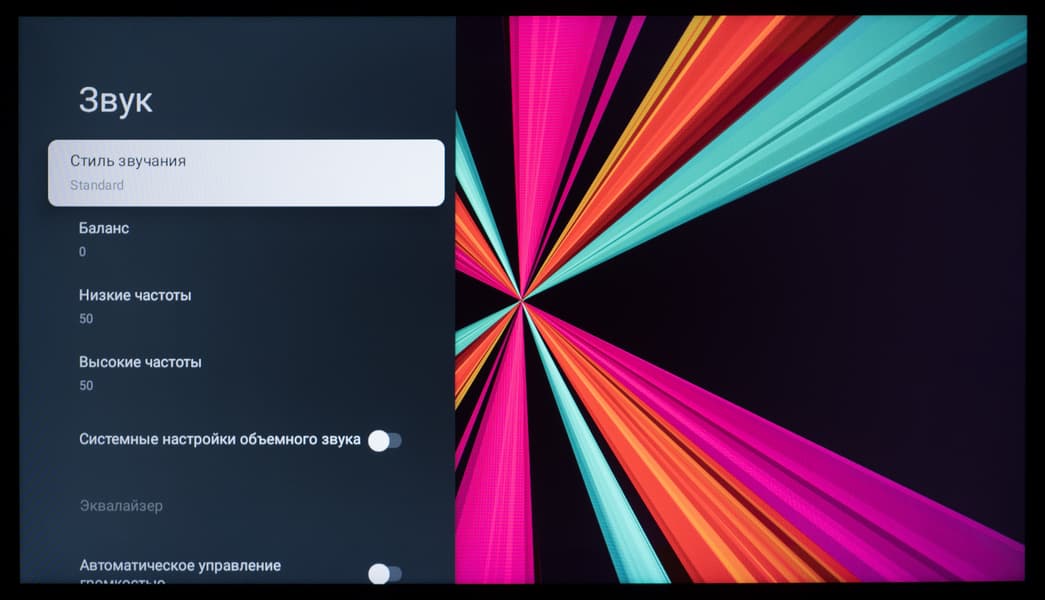 Как было отмечено ранее, меню с настройками звука доступно в любой программе и в любом месте системы. Регулировка громкости осуществляется с помощью соответствующей качельки на пульте ДУ. Настроек звука достаточно, полезны опции для улучшения объемного звучания и выравнивания громкости.