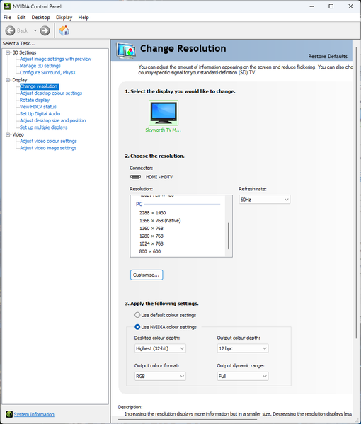 Отметим, что в режимах драйвера PC для телевизора Skyworth представлено странное разрешение — 2288×1430 пикселей. Его можно активировать, но в таком случае картинка становится очень мыльной, а все элементы на экране — слишком маленькими.