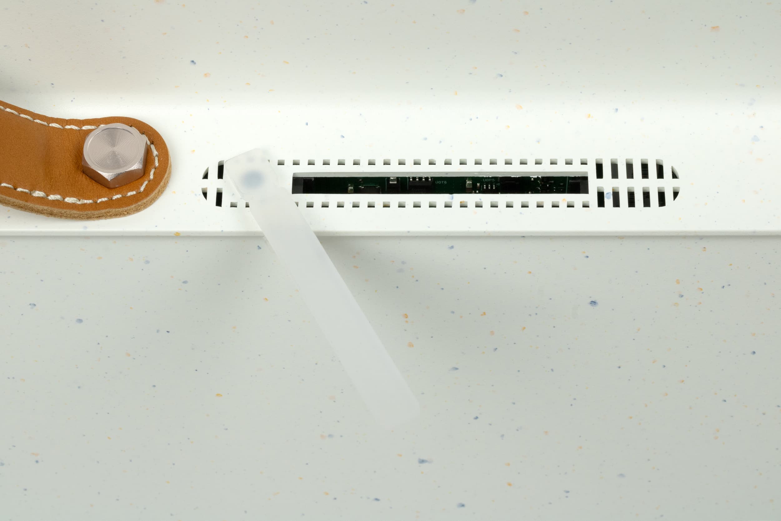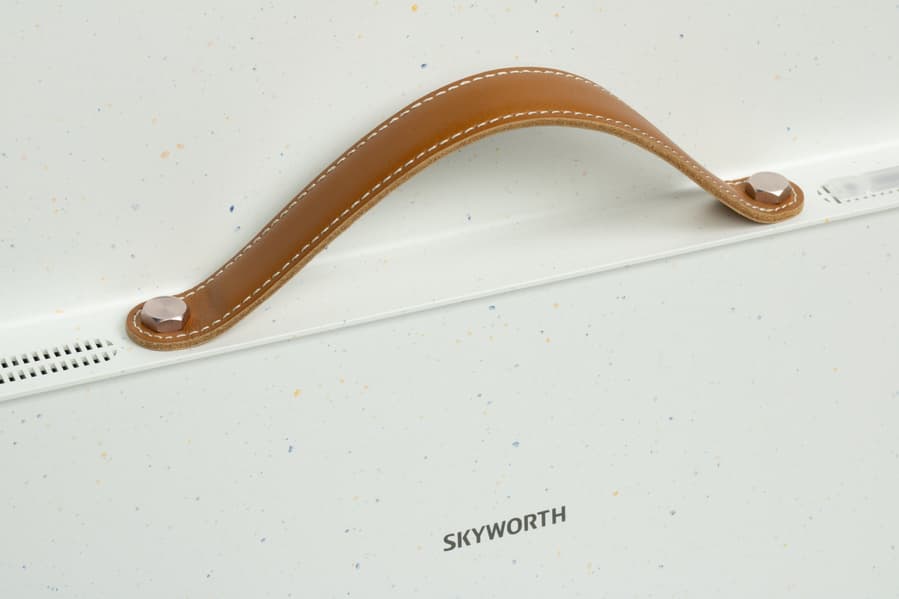 Для удобства переноски устройства компания Skyworth предлагает воспользоваться кожаной ручкой, прикрепленной на болты с широкой головкой и грубоватой полировкой — стиля ради. С точки зрения функциональности вопросов к ручке не имеем, а вот как долго она продержится в заводском состоянии и не будут ли откручиваться болты — вопросы открытые. Результат покажет только время.