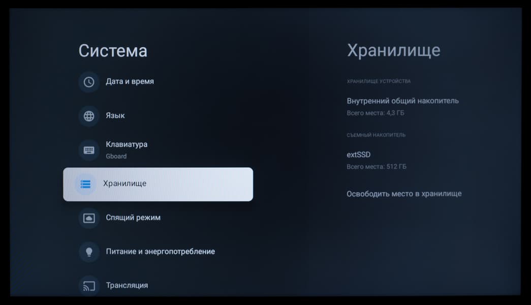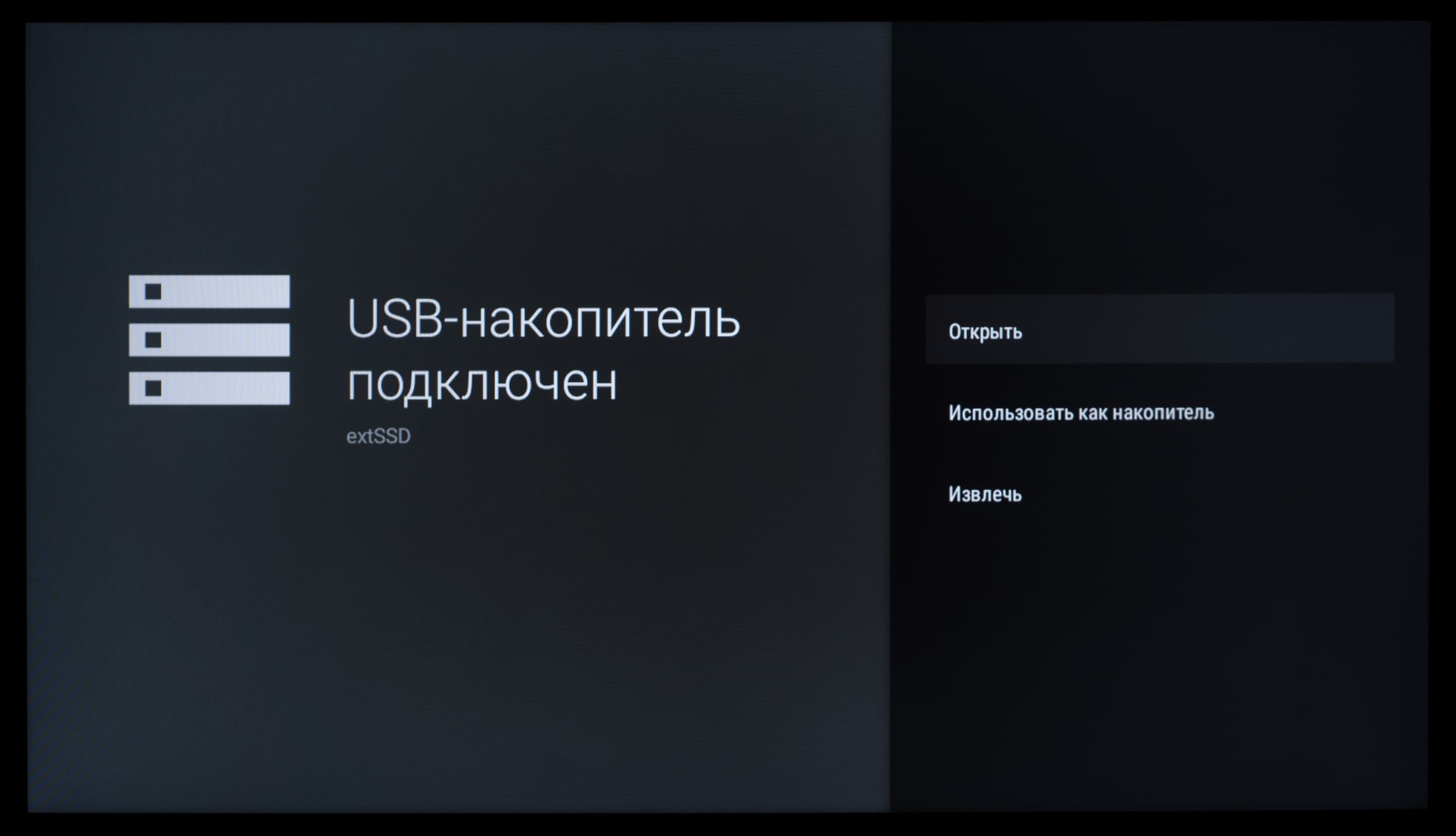 При подключении внешнего накопителя система уведомляет о его обнаружении и предлагает перейти в медиаменеджер. При переходе к этому уведомлению (в том числе и через отдельный блок со всеми собранными системой уведомлениями) вы можете открыть доступ к новому диску через встроенный проводник (с крайне ограниченной функциональностью), исправить ошибки (помогает редко) и провести его форматирование средствами системы. Но делать это вам придется редко — все наши накопители с тремя разными файловыми системами ТВ прекрасно отобразил и спокойно считывал и записывал данные.