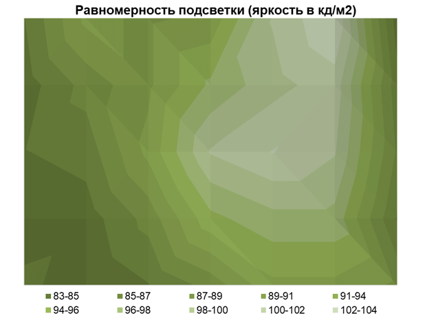 Измерения яркости проводились в 35 точках экрана, расположенных с шагом 1/6 от ширины и высоты экрана. Границы экрана не включены, настройки установлены в значения, обеспечивающие яркость белого поля в 100 нит в центральной части экрана.