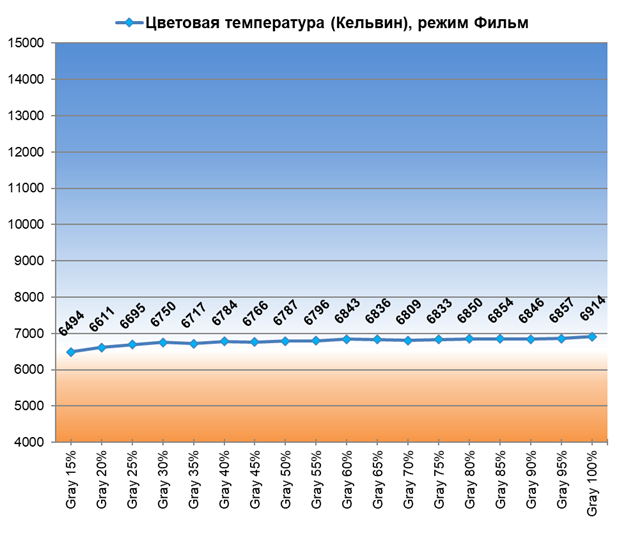 Оттенки серого в пользовательском режиме смещены в холодную зону, с минимальным проявлением паразитного оттенка. При активации режима «Фильм» меняются настройки ЦТ, а точки серого клина оказываются в зоне с Delta E < 10 — так гораздо лучше.