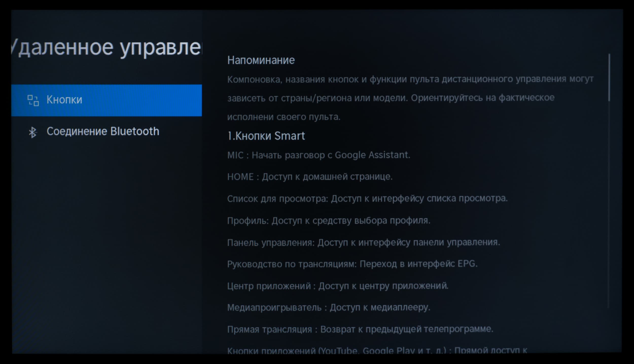 Есть несколько рядов вспомогательных кнопок с быстрым доступом к иностранным онлайн-платформам/кинотеатрам (не сильно актуальные в современных реалиях), рядом с ними кнопка быстрых действий (настраиваются через специальное приложение), качелька регулировки громкости, кнопка вызова голосового ассистента и навигационный блок с центральной кнопкой подтверждения/вызова основного меню с настройками картинки и звука. Центральная кнопка подтверждения, у нашего экземпляра, слегка шаталась и создавала при каждом нажатии неприятный звук.