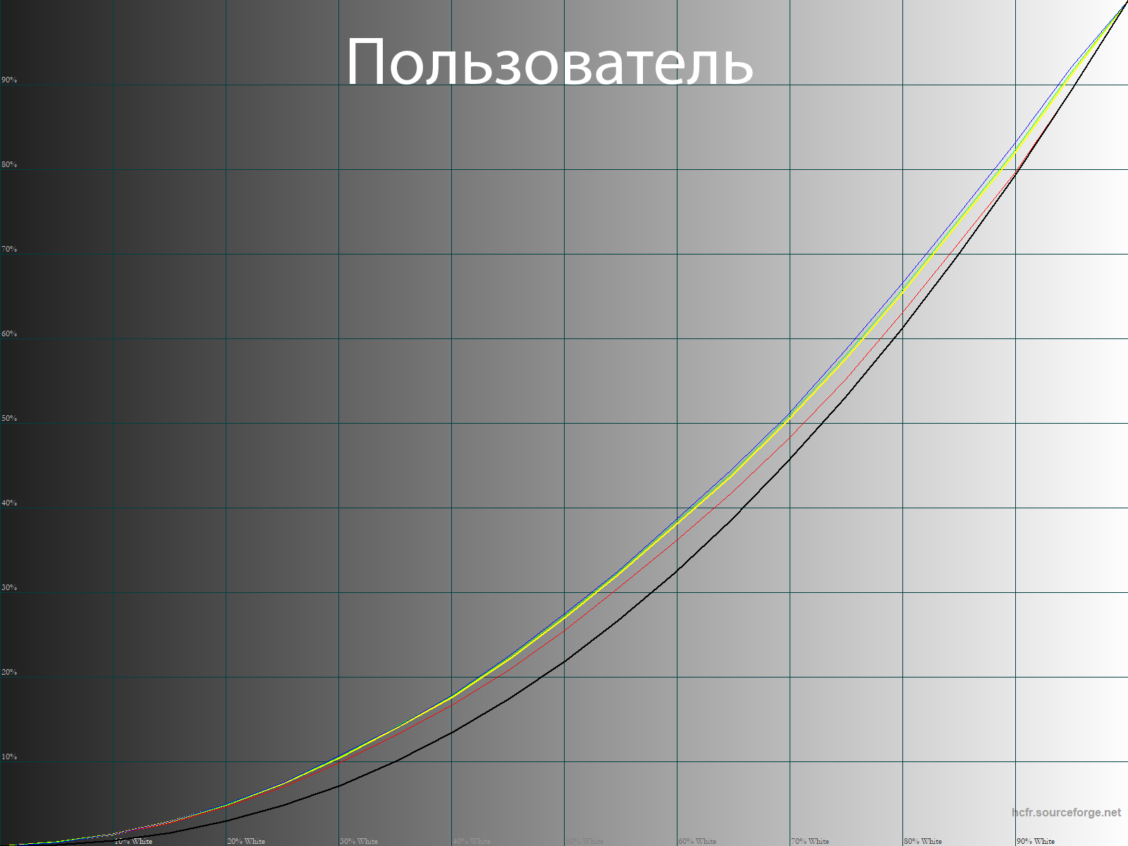 Ниже приведен спектр для белого поля (белая линия), наложенный на спектры красного, зеленого и синего полей (линии соответствующих цветов) для режима экрана пользовательских настроек с полной цветовой гаммой: