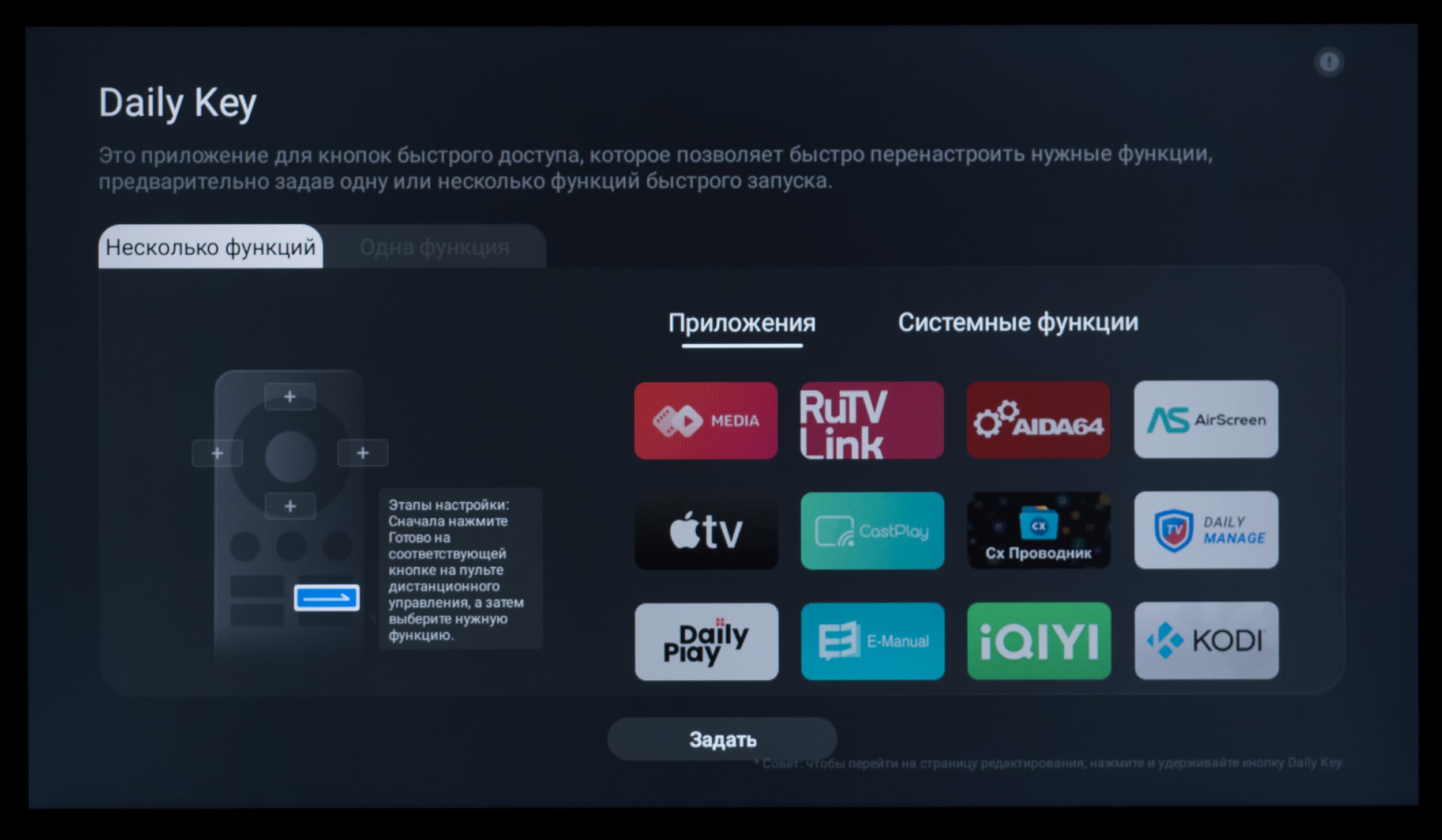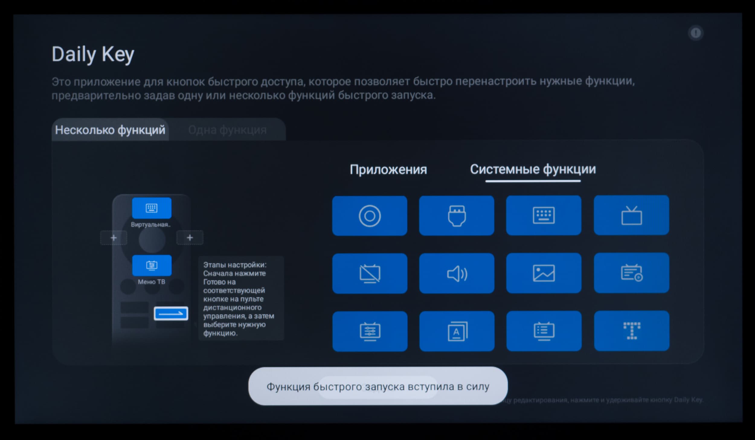 Для удобного доступа к важным функциям от пользователя потребуется настройка приложения Daily Key, переход к которому осуществляется по специальной кнопке на пульте ДУ, обозначенной синей стрелкой вправо. Утилита позволяет указать нужную функцию для четырех кнопок, и в последующем переход в само приложение больше не потребуется. Мы выбрали «Меню ТВ» и «Виртуальная клавиатура».