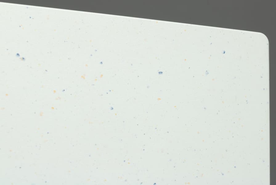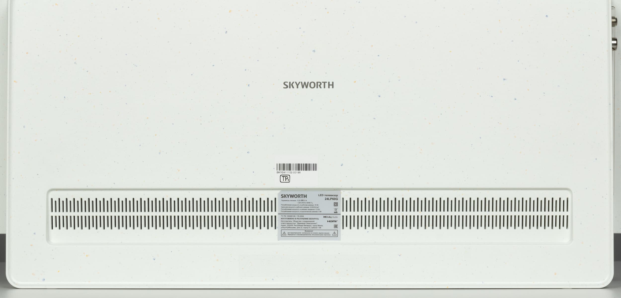 Сзади телевизор Skyworth продолжает удивлять — весь пластик здесь с заметными вкраплениями синих и желтых оттенков. Выглядит как рабочая поверхность (или столешница на кухне) из искусственного камня по типу Samsung Staron в светлых оттенках с финишной полировкой. Сверху и с боков панель заходит на торцы и образует окантовку экрана.