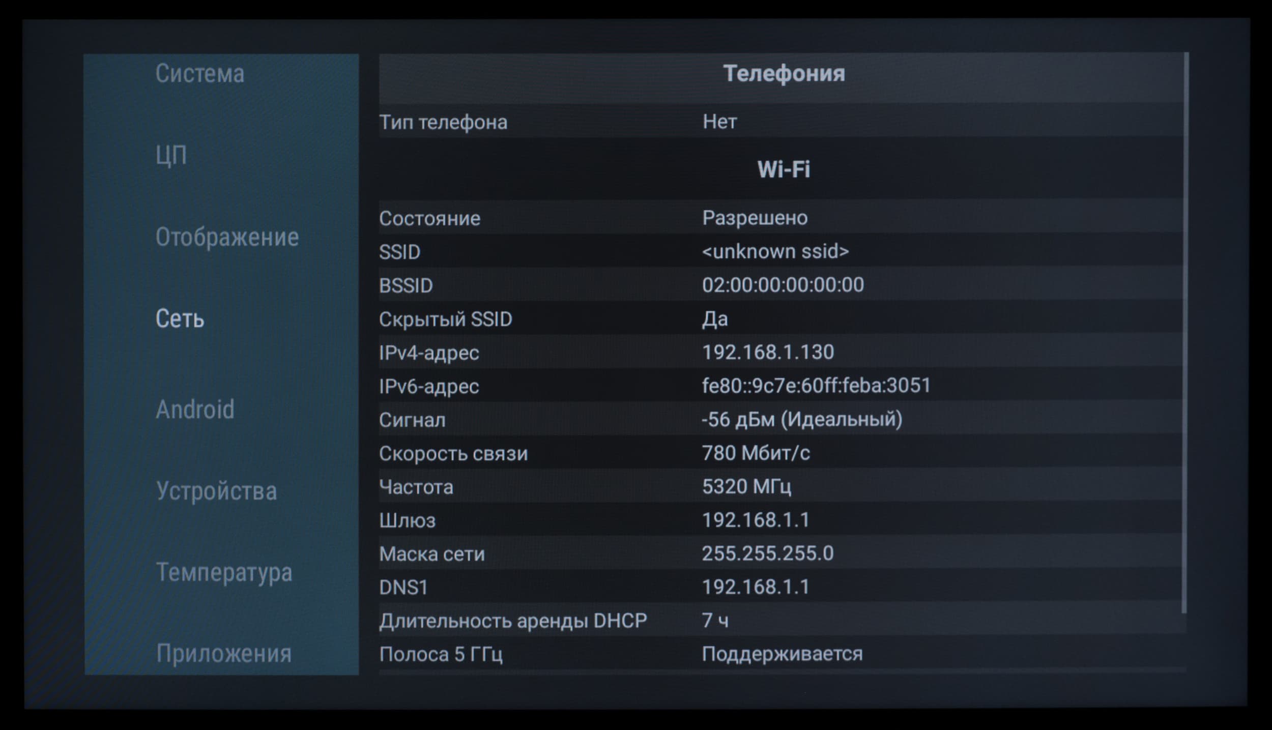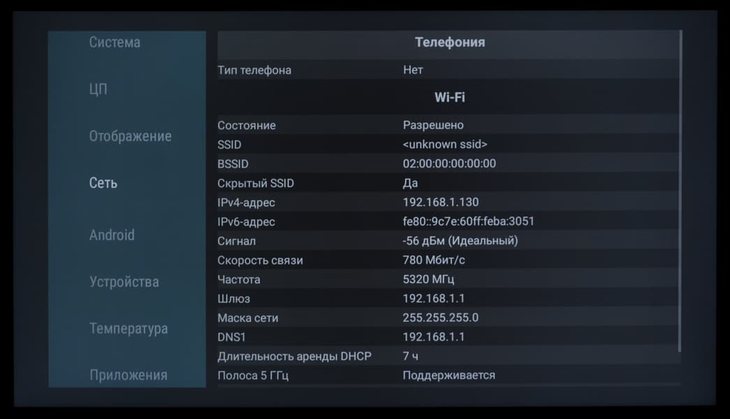 В развернутой сети 5 ГГц на базе роутера Keenetic Hopper (KN-3810), при нахождении телевизора в 5 метрах по прямой от него с преградой в виде монолитной стены, телевизор Skyworth продемонстрировал стабильную скорость подключения 750-780 Мбит/c (тип подключения — 11ac/k/r/v, 2×2 80 МГц). Это очень высокий результат.