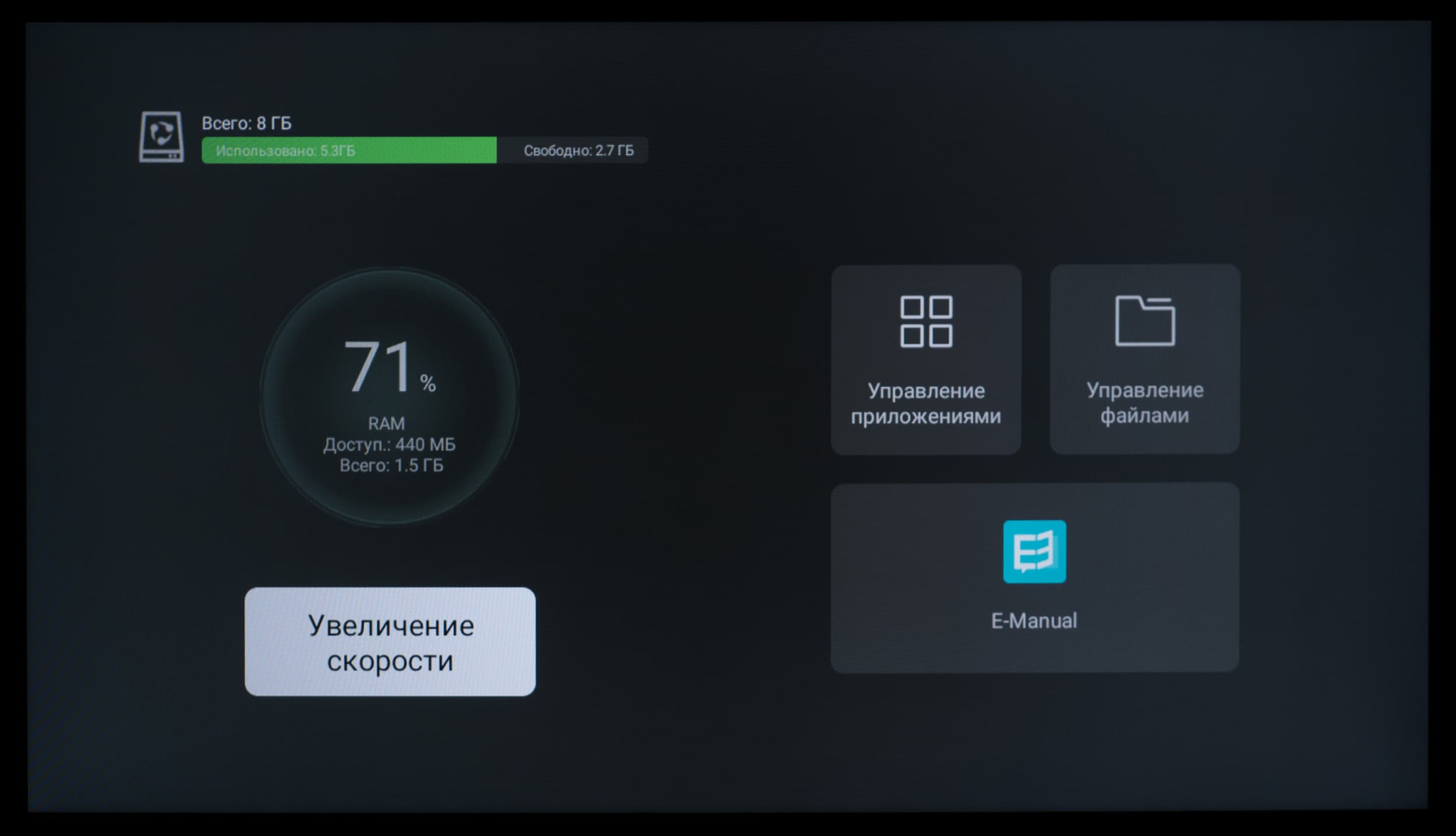 У телевизора есть предустановленный «ТВ менеджер» для быстрой оптимизации памяти, чистки «мусора», удаления и установки программ, проверки использования данных (памяти). Из приложения можно быстро добраться и до электронной инструкции.