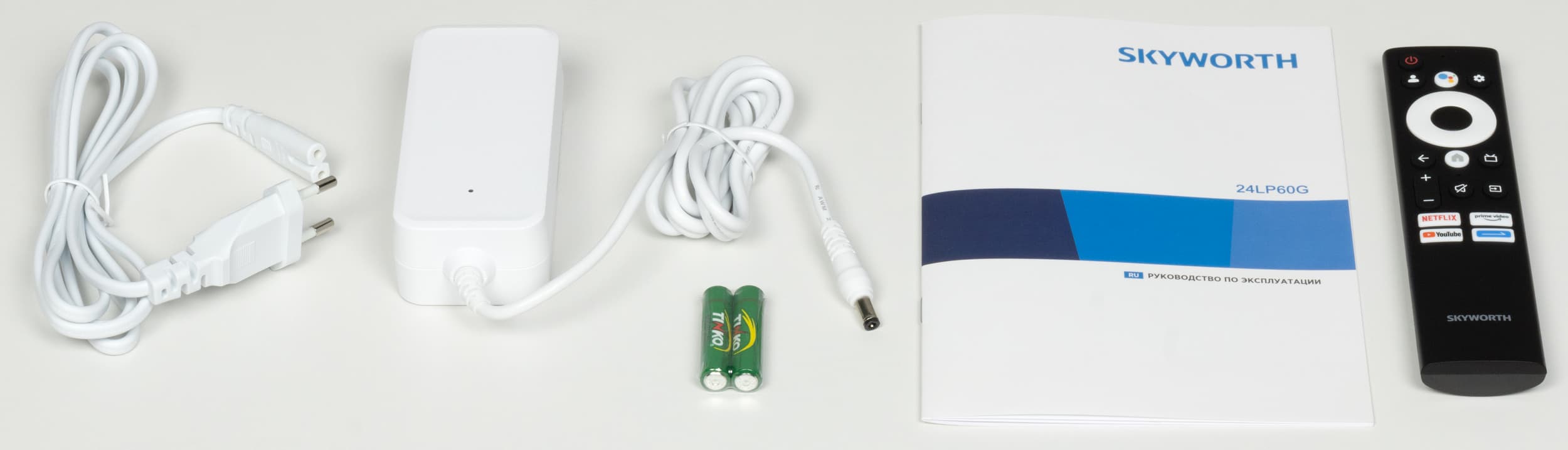 Комплект поставки включает в себя всё необходимое: кабель питания, внешний блок питания, руководство по эксплуатации, две батарейки ААА, пульт ДУ.