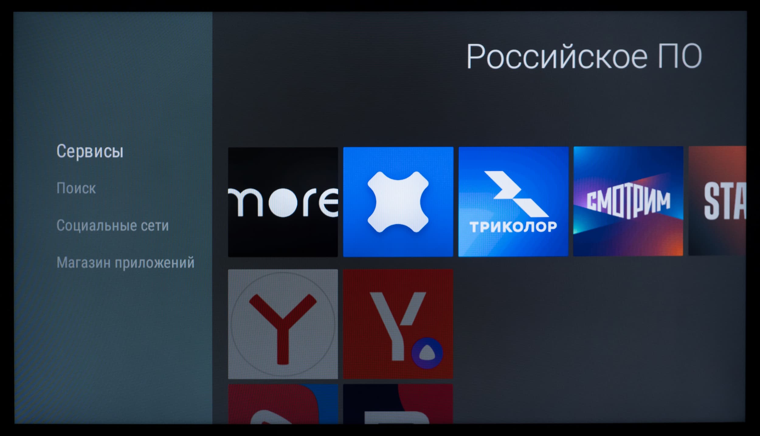 В телевизоре предустановлено некоторое количество популярных приложений, в основном ориентированных на западную аудиторию. Для удобства скачивания программ более актуальных на территории РФ предлагается воспользоваться утилитой «Российское ПО», представляющее собой знакомый нам — небольшой «магазин» с четырьмя разделами.