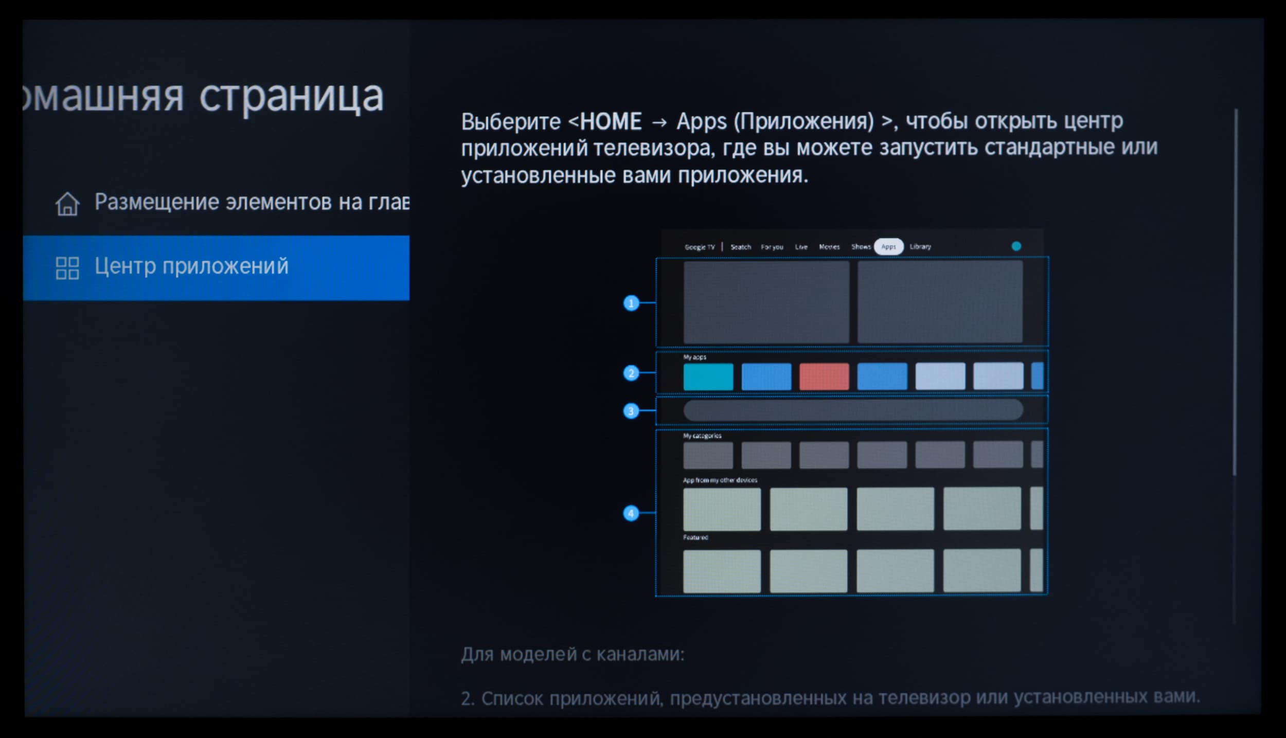 Он представляет собой несколько горизонтальных лент с плитками избранных установленных приложений, избранного контента и рекомендуемого контента, предоставляемого различными программами, в том числе с разбивкой на каналы. Надписи слева над лентами поясняют, к чему относится содержимое лент.