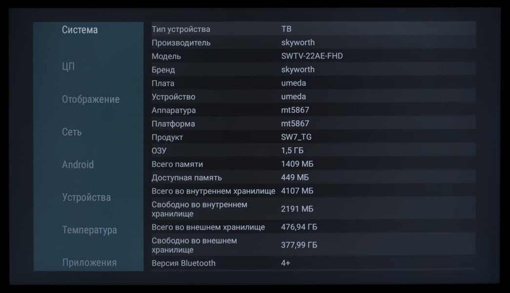 Телевизор Skyworth оснащен небольшой VA-матрицей, что несколько снижает стабильность изображения по площади матрицы и ухудшает углы обзора. Но поскольку в «походных» условиях, вряд ли, кто будет предъявлять серьезные требования к стабильности картинки, то для просмотра людьми примерно с одной точки проблем возникнуть не должно вовсе.