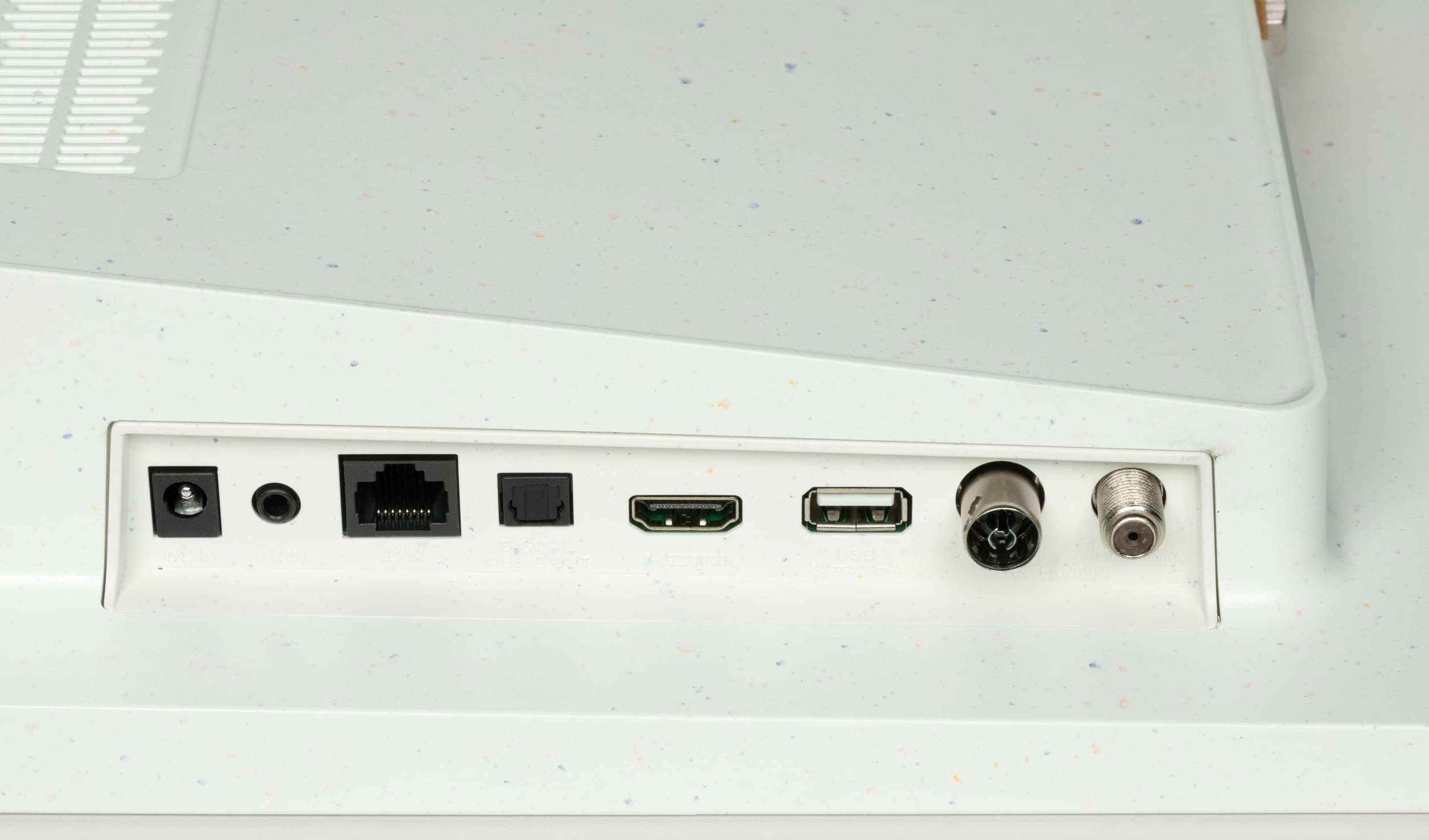 К нашему удивлению, несмотря на портативность модели, производитель разместил в телевизоре гораздо больше интерфейсов, чем могут потребоваться большинству покупателей. Предусмотрена возможность просмотра через проводное подключение к антенне, кабельному и спутниковому ТВ, подключение к ПК или игровым приставкам по HDMI. Единственный разъем USB 2.0 подходит для подключения различных накопителей или прочей периферии и обеспечивает максимальный ток до 0.5 А.