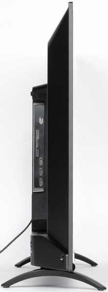 Задняя панель условно в верхней части представляет собой единую деталь, закрывающую телевизор сзади и переходящую в окантовку экрана сверху и с боков. Изготовлена задняя панель из тонкого листа стали и имеет стойкое черное матовое покрытие. Выступающий назад кожух в центральной и в нижней части с заходом на нижний торец изготовлен из черного пластика с матовой поверхностью. Интерфейсные разъемы размещены в двух нишах на этом кожухе. Часть разъемов направлена вниз, часть вбок. Спереди дотягиваться до разъемов, направленных вбок, не очень удобно. Подключать кабели к разъемам, направленным вниз, будет очень неудобно при размещении телевизора на стене. Тонким этот телевизор назвать сложно.