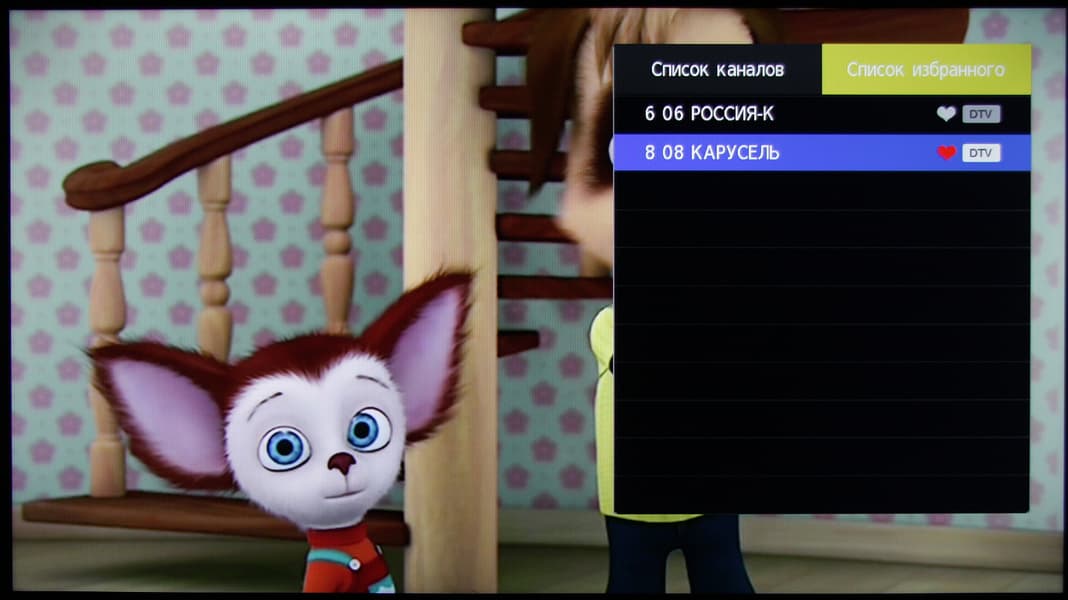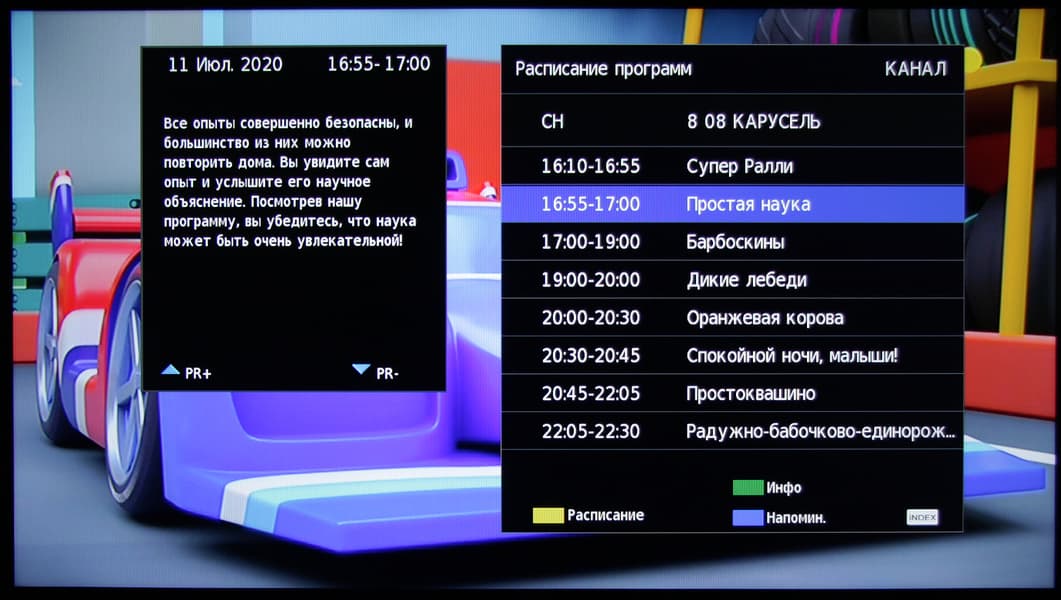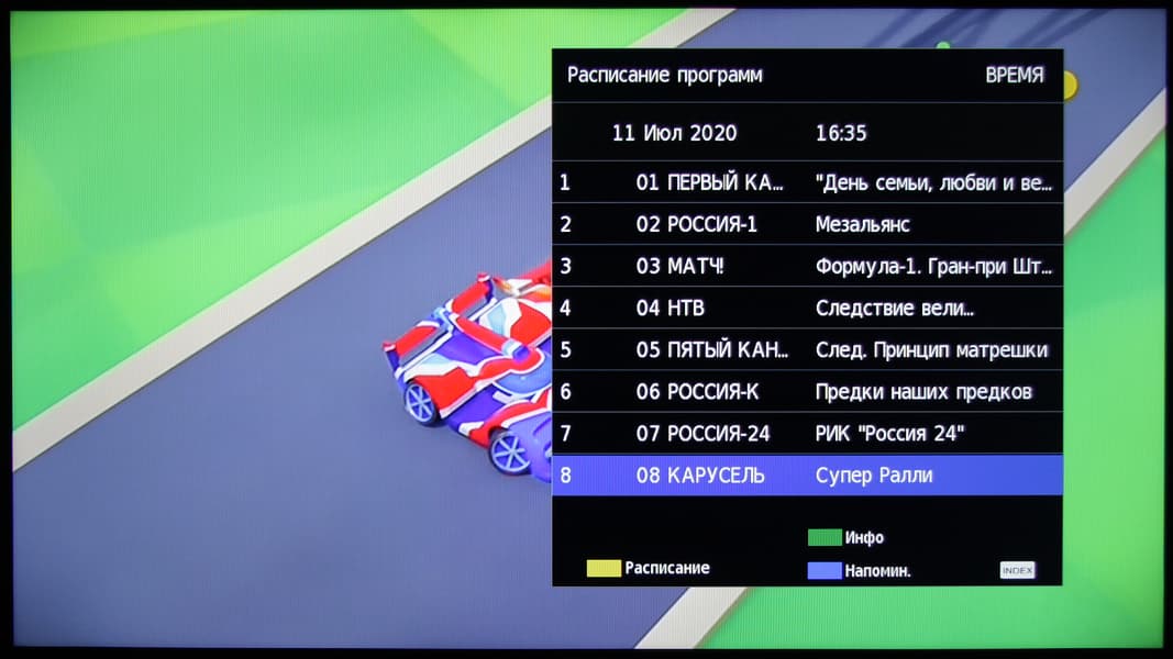 Есть базовая поддержка электронной программы передач (если она передается) — можно посмотреть, что именно сейчас идет на текущем и других каналах, но нужно отдельное действие, чтобы вывести на экран расписание текущего канала.