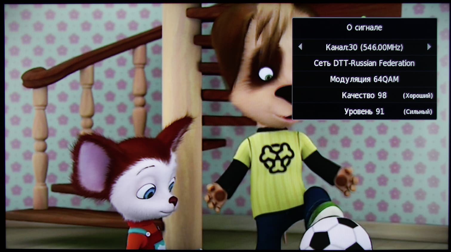 Данная модель, помимо спутникового тюнера, оснащена тюнером, принимающим аналоговый и цифровой сигнал эфирного и кабельного вещания. Качество приема цифровых каналов на дециметровую антенну, закрепленную на стене здания (почти прямая видимость в направлении на телевышку в Бутово, расположенную на расстоянии 14 км), было на высоком уровне — удалось найти ТВ-каналы во всех трех мультиплексах (всего 30, плюс 3 канала радио).