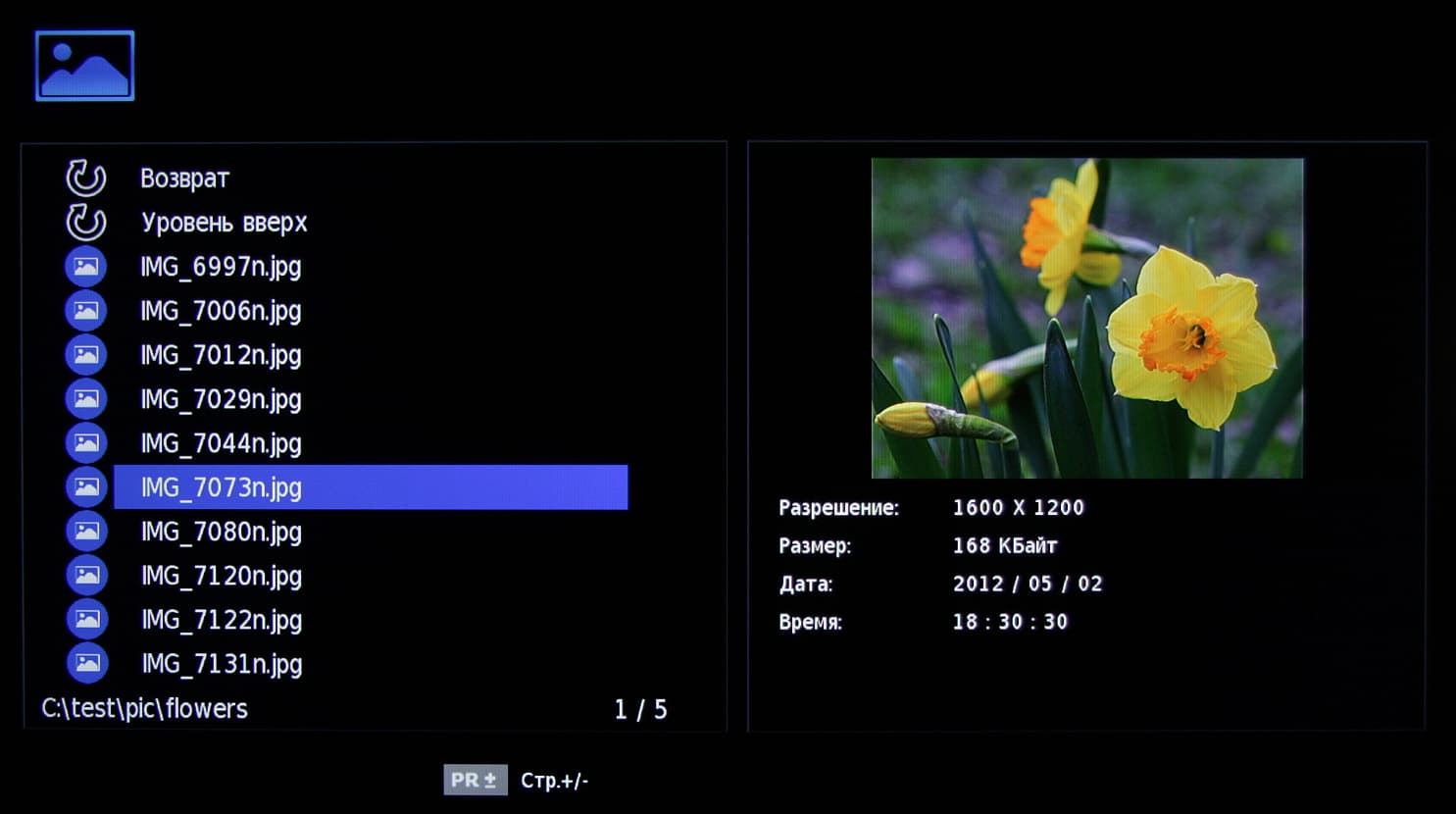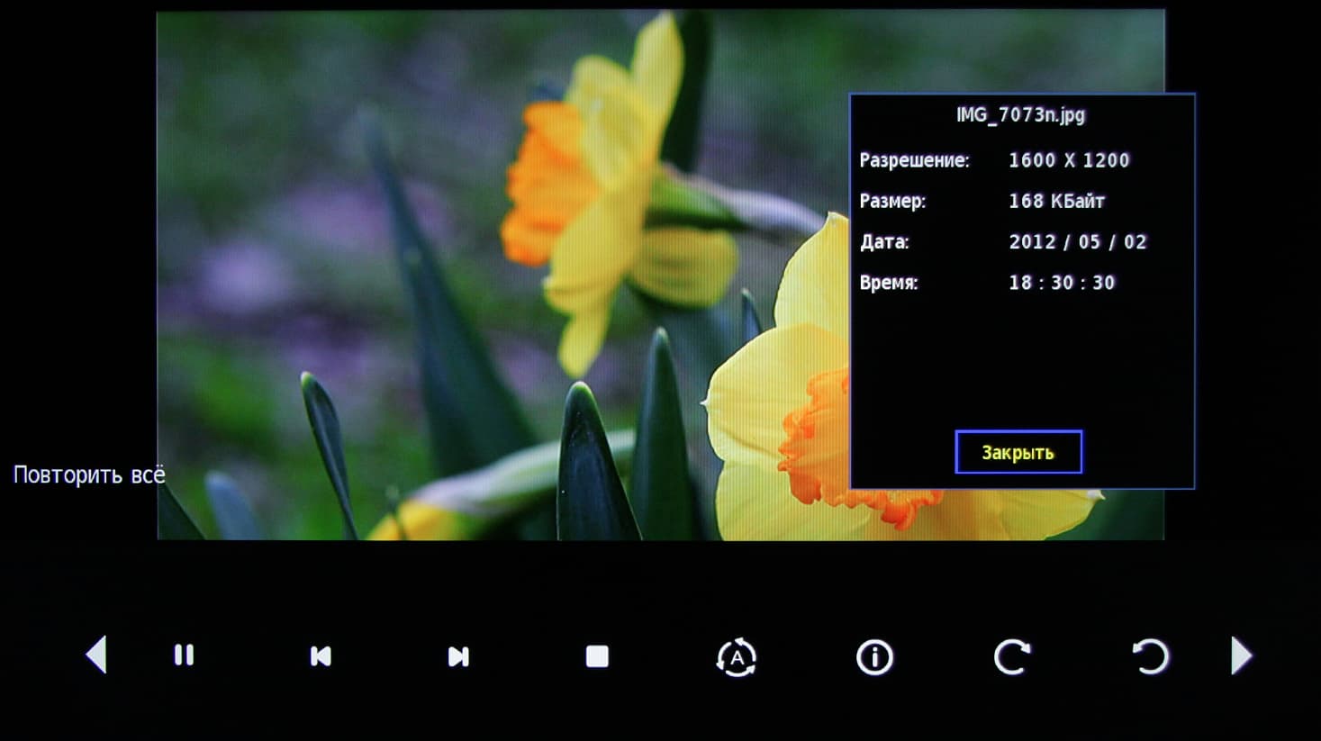 Нами подтверждена способность телевизора показывать растровые графические файлы в форматах JPEG, MPO (один ракурс), PNG и BMP, в том числе в виде слайд-шоу с эффектами перехода. JPEG-изображения размером 1920×1080 пикселей выводятся один к одному по пикселям в истинном разрешении Full HD, правда с небольшой потерей в цветовой четкости по горизонтали.