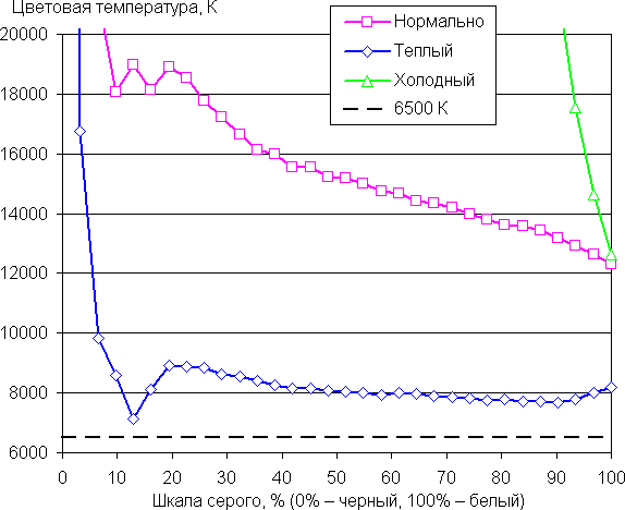 Видно, что в любом случае цветовая температура существенно выше стандартных 6500 К. В случае варианта Теплый цветовая температура ближе всего к 6500 К, однако ΔE на белом поле гораздо выше, чем на основной части шкалы серого, смотрится это очень плохо, поэтому в итоге визуально цветовой баланс лучше всего в случае профиля Нормально, несмотря на более высокую цветовую температуру.