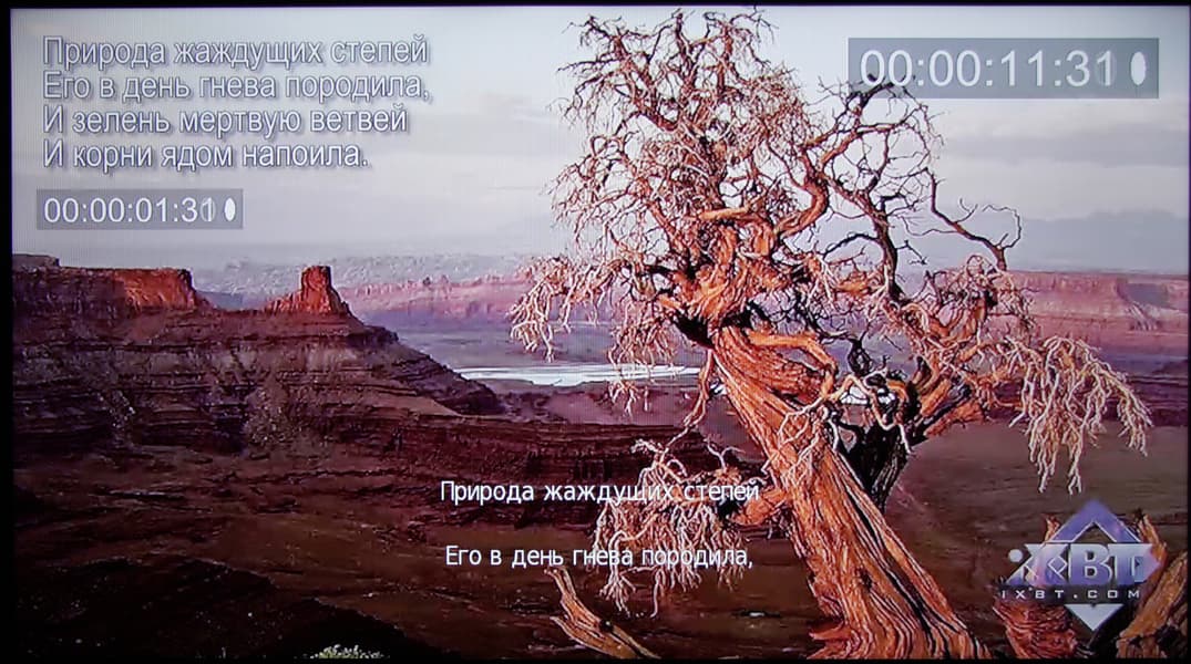 К видеофайлам плеер ТВ привередлив. Можно рассчитывать на более-менее нормальное воспроизведение файлов MPEG-2 (Main@High), MPEG-4 (AVC), WMV и некоторых MKV (AVC), да и то, как повезет, разрешением не выше Full HD. Поддерживается несколько звуковых дорожек в разнообразных форматах (но дорожки DTS не воспроизводятся) — они переключаются кнопкой на пульте или в контекстном информационном меню, внешние и встроенные текстовые субтитры (русские должны быть в кодировке Windows-1251 или в Unicode). С субтитрами, впрочем, тоже как повезет — часто вставляются лишние строки, в результате чего не весь текст помещается на экран, да и вариант вывода только один, не самый читаемый. Ниже приведен пример вывода тестового файла — внизу по центру то, что выводит ТВ в виде текстовых субтитров, а вверху слева — тот текст, который должен быть, в виде нарисованной в кадре графики.