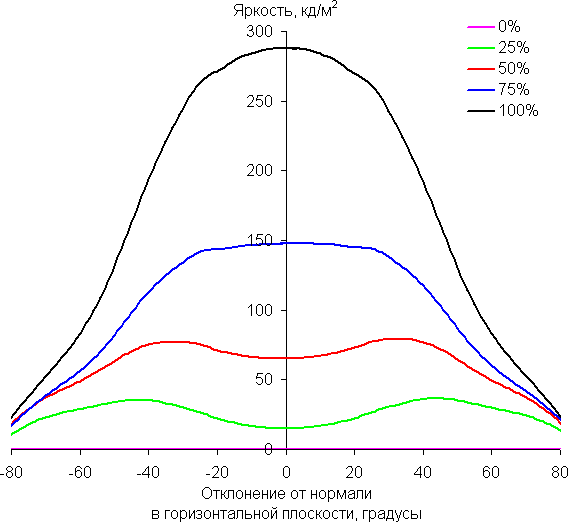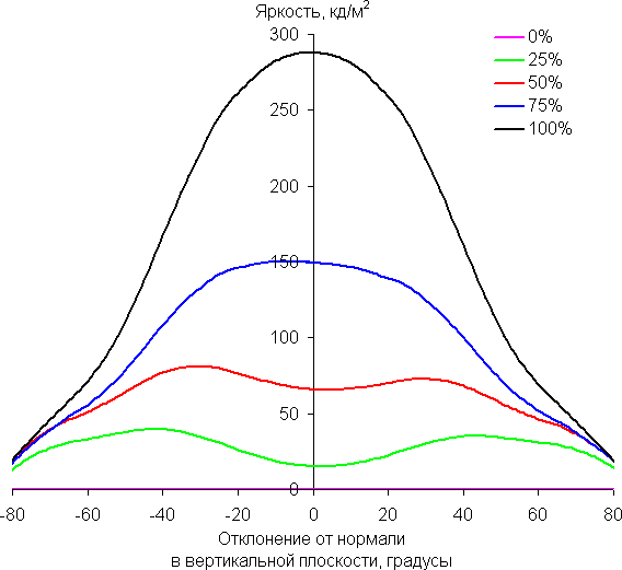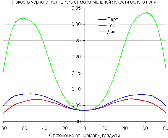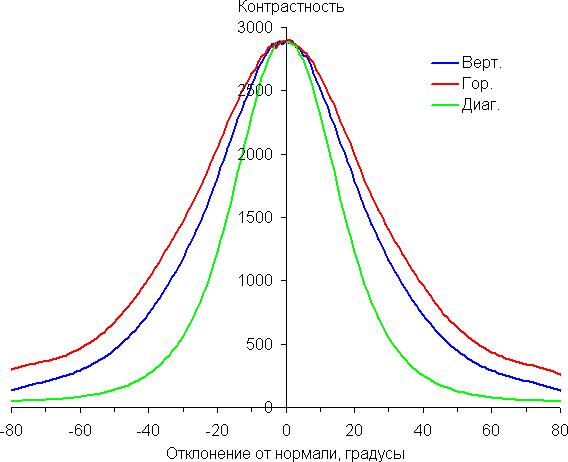 Отметим плавное и медленное уменьшение яркости даже при относительно большом отклонении от перпендикуляра к экрану во всех трех направлениях. Это хорошо, но нетипично для контрастных матриц типа VA. Под очень большими углами графики яркости некоторых полутонов пересекаются, то есть яркость оттенков инвертируется, но в реальной ситуации этого видно не будет. Яркость черного поля при отклонении от перпендикуляра к экрану возрастает, но всего до примерно 0,35% максимум от максимальной яркости белого поля. Это также хороший результат. Контрастность в диапазоне углов ±82° не опускается ниже отметки 10:1.
