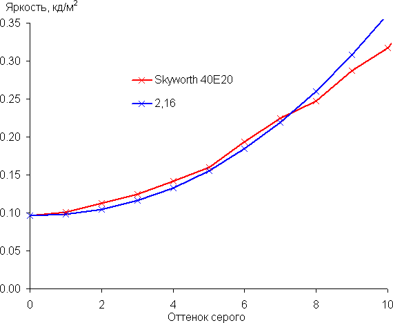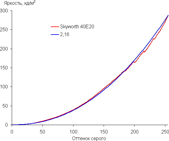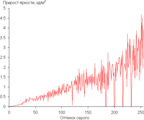 Для оценки характера роста яркости мы измерили яркость 256 оттенков серого (от 0, 0, 0 до 255, 255, 255). График ниже показывает прирост (не абсолютное значение!) яркости между соседними полутонами:
