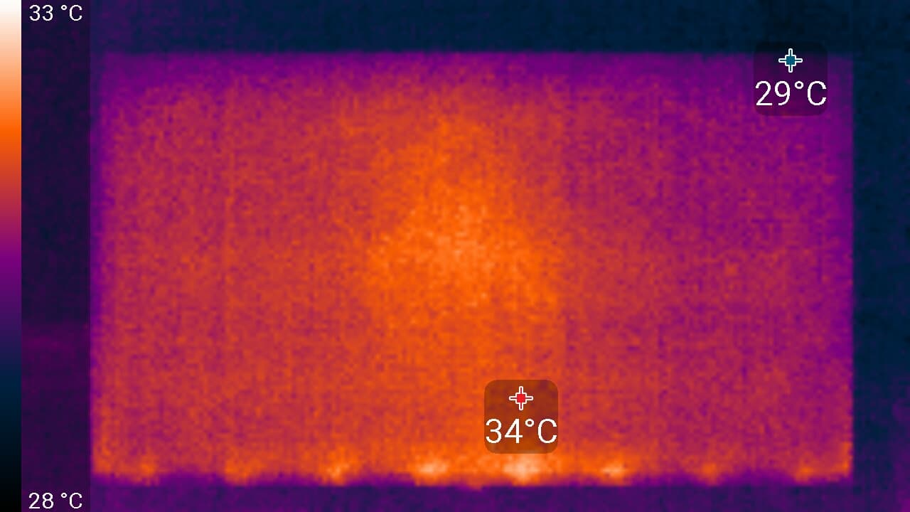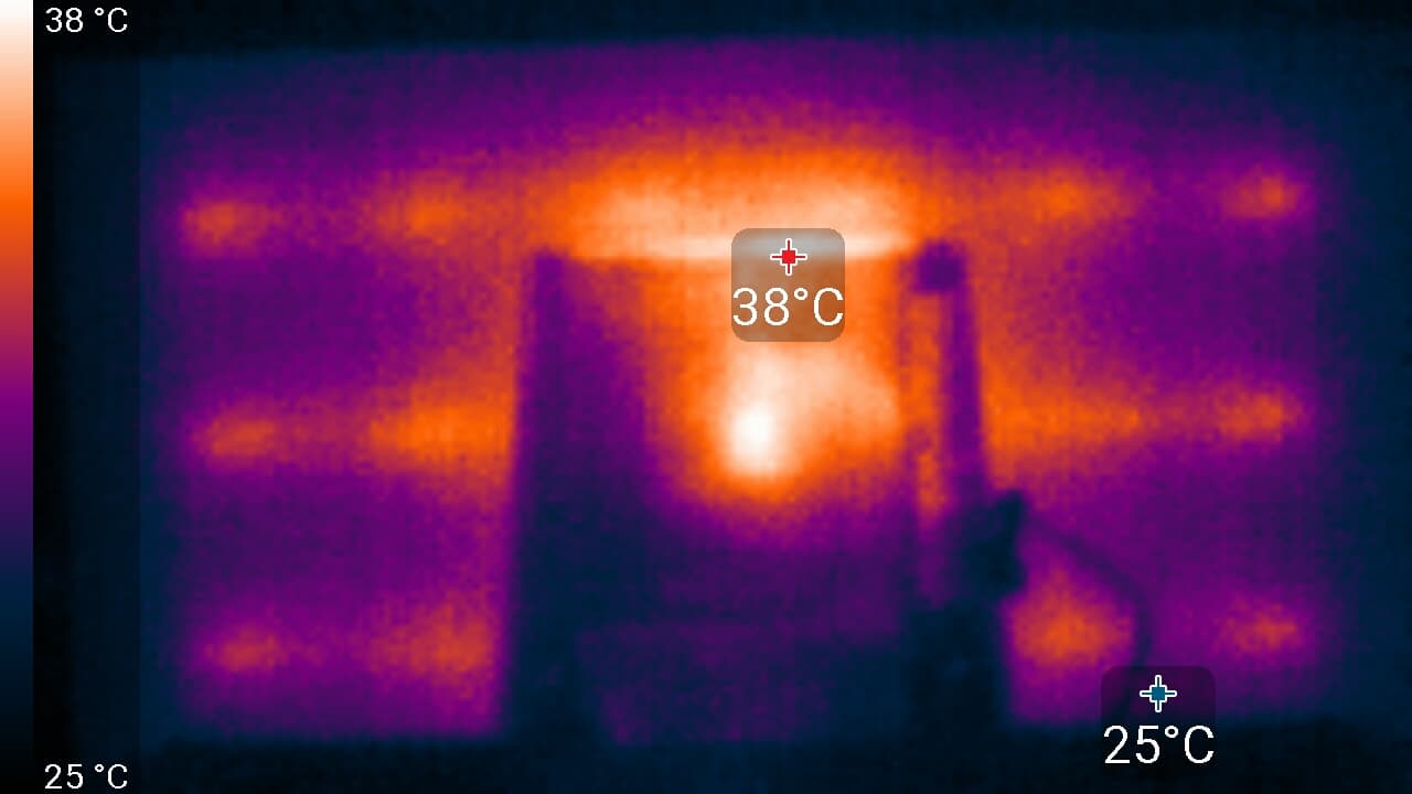 Нагрев телевизора спереди можно оценить по приведенному снимку с ИК-камеры, полученному после долговременной работы на максимальной яркости в помещении с температурой примерно 24 °C: